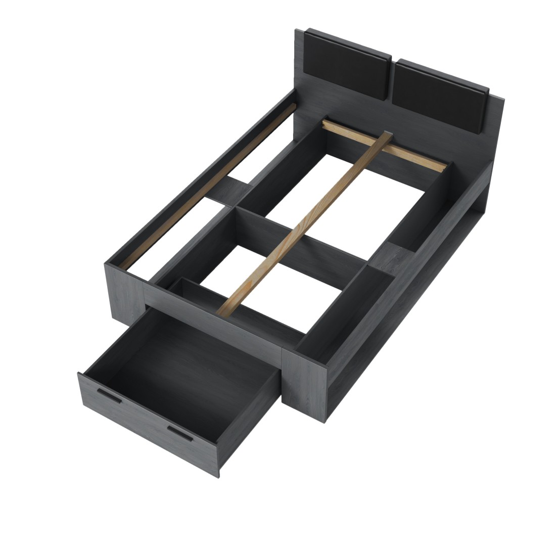Lit adulte 140x200 avec sommier et tiroirs intégrés - Collection FLOYD. Coloris gris effet bois.