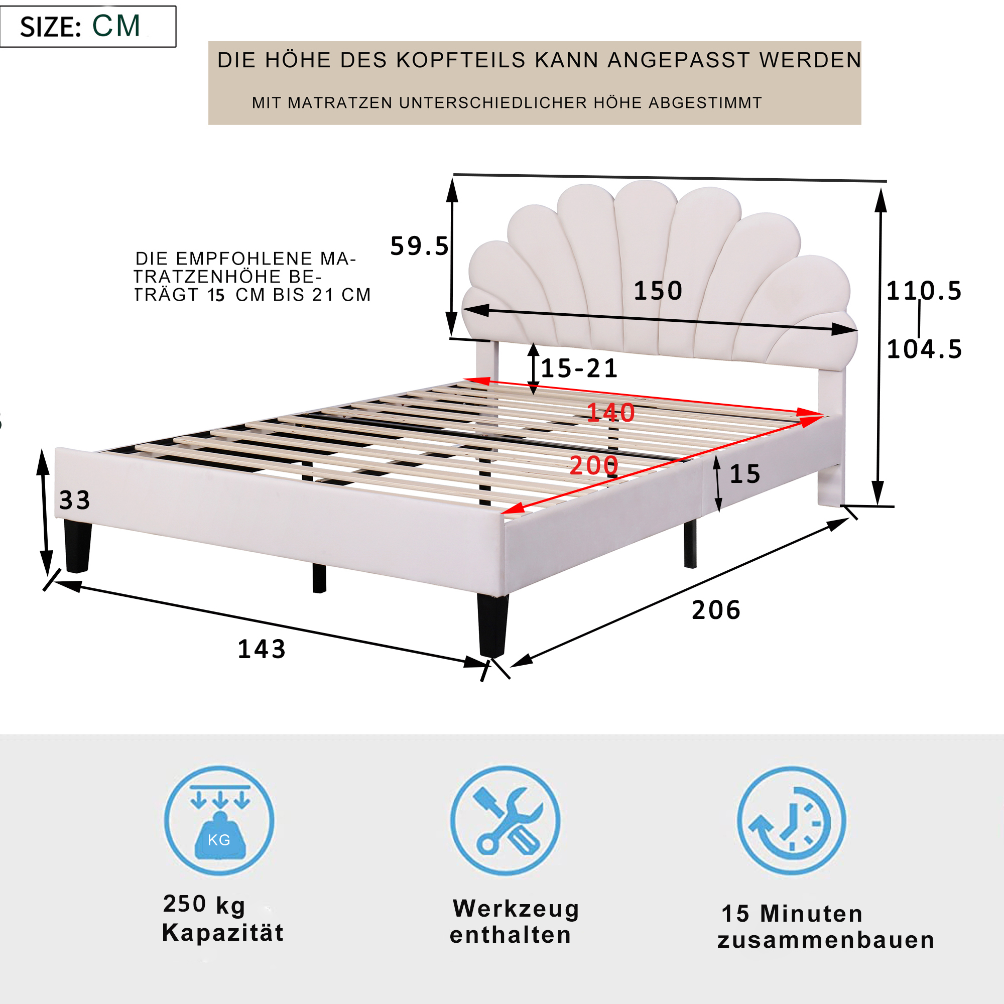 | Libellé | Lit Adulte Double 140x200cm, avec Tête de Lit Fleurie et Sommier, Velours, Beige, sans Matelas |