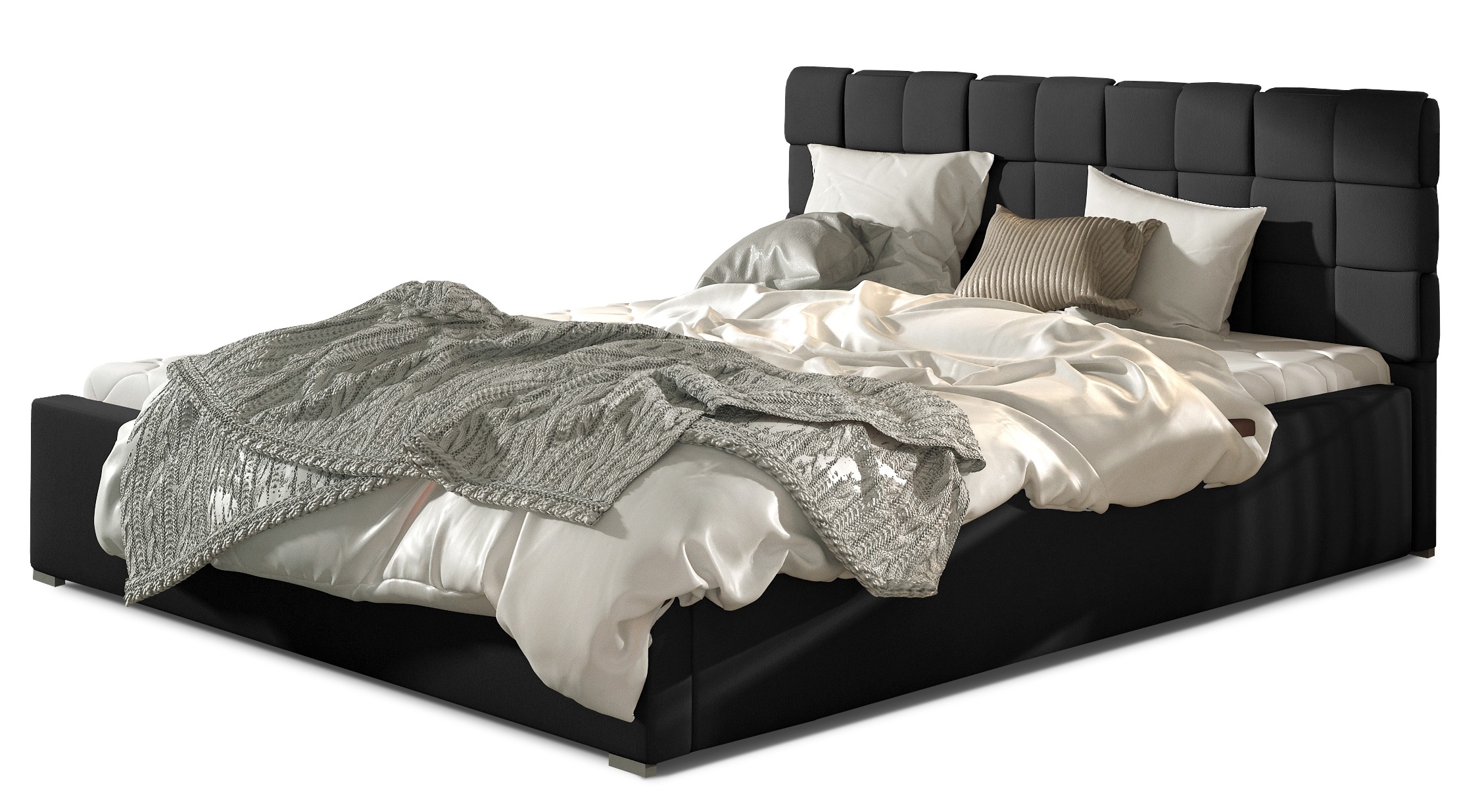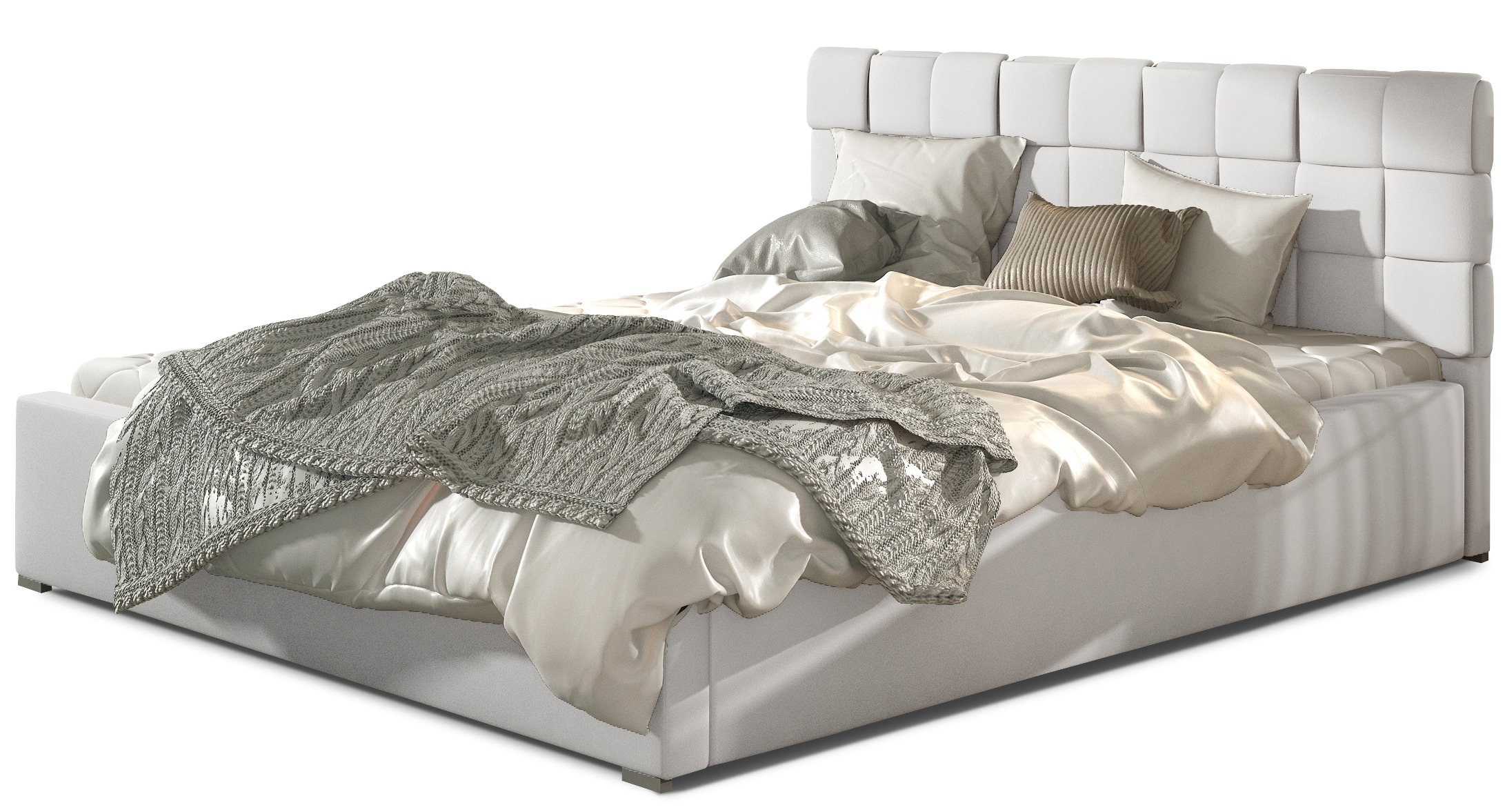 L'élégance à son meilleur, le lit Kandy avec coffre de rangement PU blanc pour un couchage de 160x200 cm est un choix extrêmement populaire parmi ceux qui privilégient la qualité de leur sommeil avant toute autre chose. Les lignes modernes du lit sont accentuées par des garnitures de bon goût et des pieds en PVC au style élégant. Le cadre et la tête de lit sont rembourrés de mousse T25 douce et résistante. La tête de lit présente des coutures à motifs carrés qui imitent le capitonnage et s'agencent bien aux chambres modernes. Il est recouvert d'un PU de haute qualité italien, résistant à l'usure et à la décoloration. Il existe aussi en d'autres coloris et dimensions. Coloris : blanc Couchage 160x200 cm - L 180 x H 83 x P 223 cm Poids : 92 kg Hauteur contour de lit : 34 cm Sommier : cadre en métal à 48 lattes en bois de bouleau avec un mécanisme assisté par vérins, mécanisme + vérins à air comprimé Coffre de rangement: P 200 x L 150 x H 16 cm pour profiter de l’espace au-dessous du lit ( fond en bois MDF). Revêtement : PU doux italien haute qualité - 100% PU - Garnissage poids : 425 g/m². - Résistance du revêtement à l'abrasion - Tissu inflammable et anti-taches - Rembourrage : Mousse de polyuréthane haute qualité - densité 25 kg/m3 Structure : Bois massif et panneau de particules Fabrication européenne - Garantie 5 ans Entretien : Facile nettoyer avec un chiffon humidifié Nombre de colis : 4 183x96x15 cm 183x37x15 cm 206x34x37 cm 70x17x17 cm