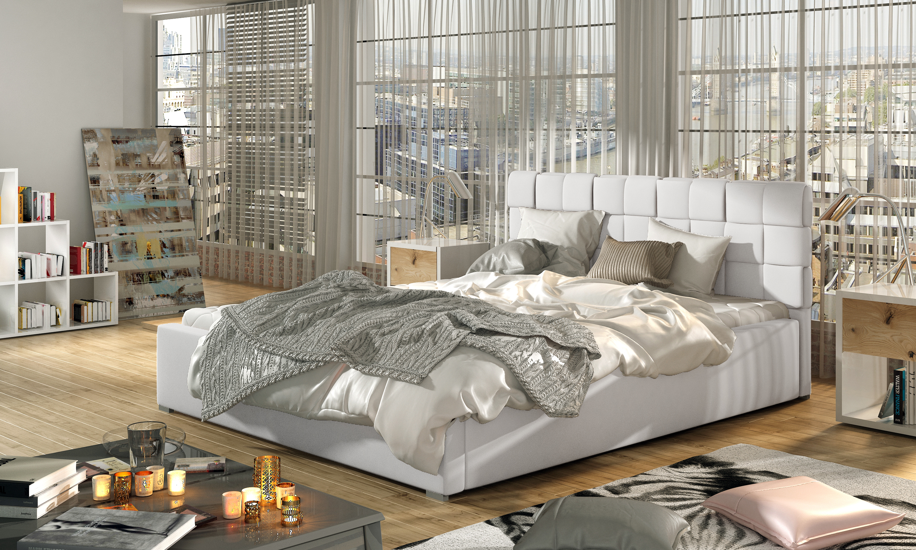 Lit avec coffre de rangement 160x200 capitonné PU blanc Kandy