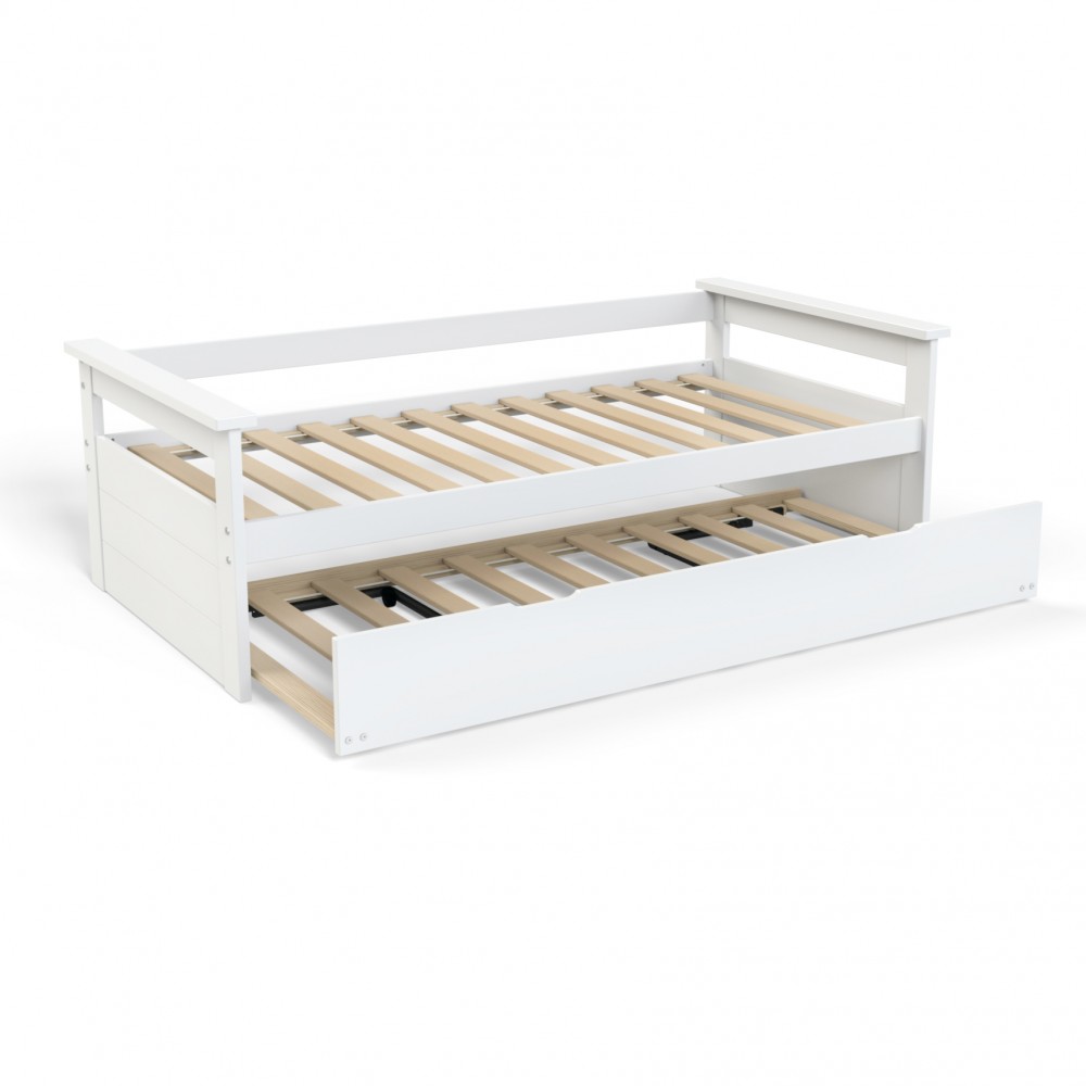 Malin, le lit gigogne combine 2 couchages en 1, idéal pour accueillir des amis ou simplement agrandir le couchage principal. Gain de place et de temps assuré grâce à son tiroir-lit monté sur roulettes.