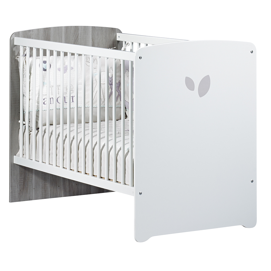 Lit bébé 120x60 - Sérigraphie Feuilles- Sommier 3 positions - NEW LEAF Lit bébé 120x60 têtes panneaux non transformable Une collection mixte qui s'affiche nature et tendance, aux tons chêne silex et blanc. 2 galeries fixes, sommier réglable en hauteur 3 positions. Assorti à la commode 2 portes 1 niche référence NT162 et à l'armoire 2 portes référence NT192. Se complète idéalement avec le tiroir référence NT611. Garanti sans solvant. Panneaux garantis avec une teneur en formaldéhydes 8 mg. Fabrication Française, hormis galeries et sommier fabrication Europe Dimensions: 123 x 90 x 68 Conforme à la norme NF EN 716 n°1 & 2 (2008) + A1 février 2013 Composition: Panneau de fibres de moyenne densité (MDF) laqué blanc avec sérigraphie "feuille" gris fumé / Panneau de particules décor papier chêne silex / Galeries en hêtre laquées blanc / Sommier hêtre Conseils d'entretien Dépoussiérage chiffon sec : ni alcool, ni solvant. Tâches rebelles : éponge légèrement humide. Meuble à monter soi-même