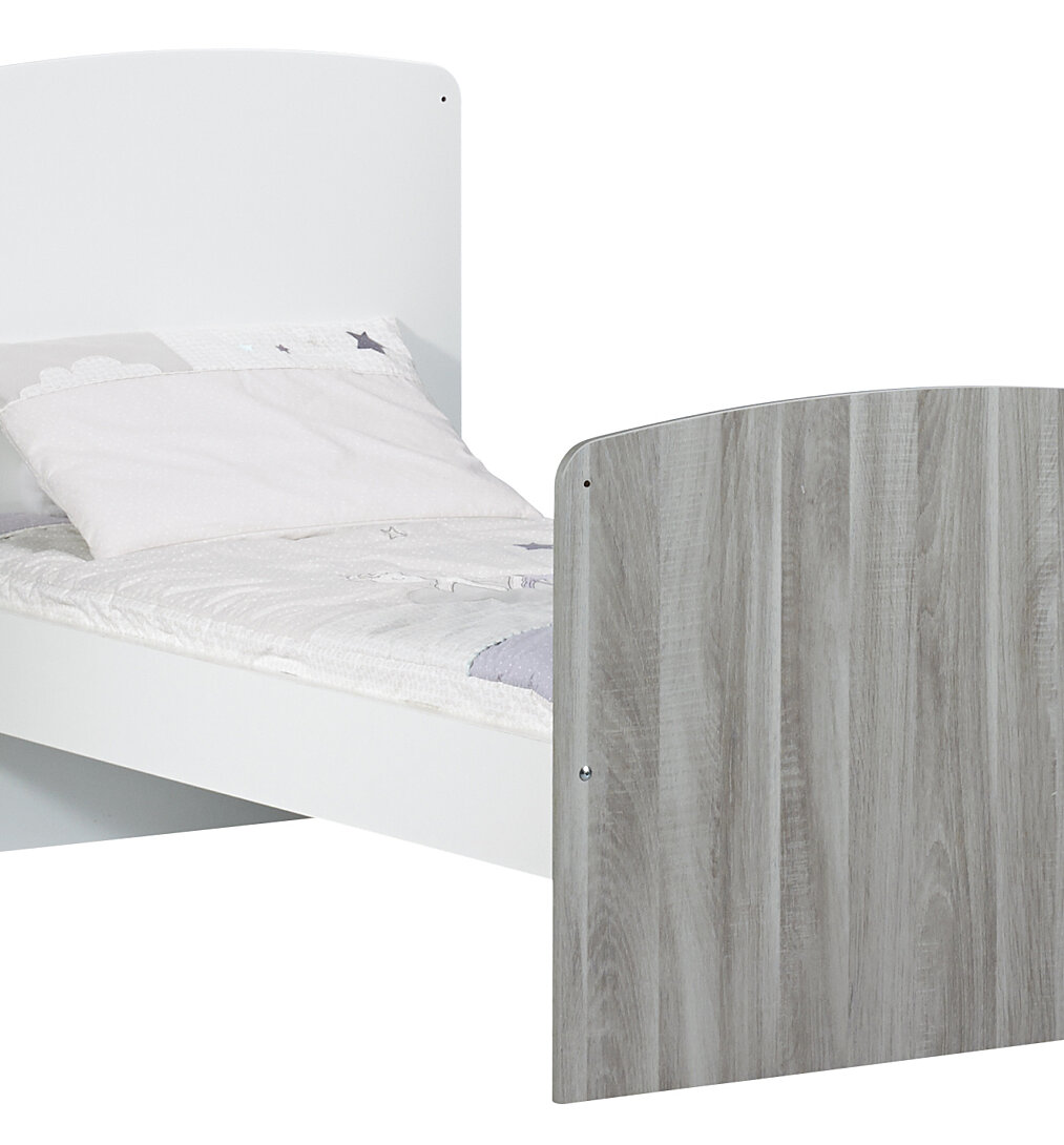 Lit bébé évolutif 140x70 - Little Big Bed NEW LEAF Une collection mixte qui s'affiche nature et tendance, aux tons chêne silex, gris fumé et blanc. Boutons "feuille" laqués "gris fumé", qui entraînera bébé dans un monde à la douceur bucolique. Grâce à son kit de transformation (inclus), il se transforme en petit lit pour jeune enfant de 3 à 7 ans. Une solution idéale pour passer au lit de grand en douceur. En version bébé : sommier réglable en hauteur 3 positions. Assorti à la commode 2 portes 1 niche référence NT162, à la commode 2 tiroirs 1 niche référence NJ161 et aux armoires 2 portes références NT192 & NJ191. Garanti sans solvant. Panneaux garantis avec une teneur en formaldéhydes 8 mg. Fabrication Française, hormis galeries et sommier fabrication Europe Dimensions: 143 x 91 x 78 Conforme à la norme NF EN 716 n°1 & 2 (2008) + A1 février 2013 Conforme à la norme NF D60-300-4 (2012) Composition: Panneau de particules mélaminé blanc / Panneau de particules décor papier chêne silex / Galeries en hêtre laquées blanc / Sommier hêtre Conseils d'entretien Dépoussiérage chiffon sec : ni alcool, ni solvant. Tâches rebelles : éponge légèrement humide. Meuble à monter soi-même