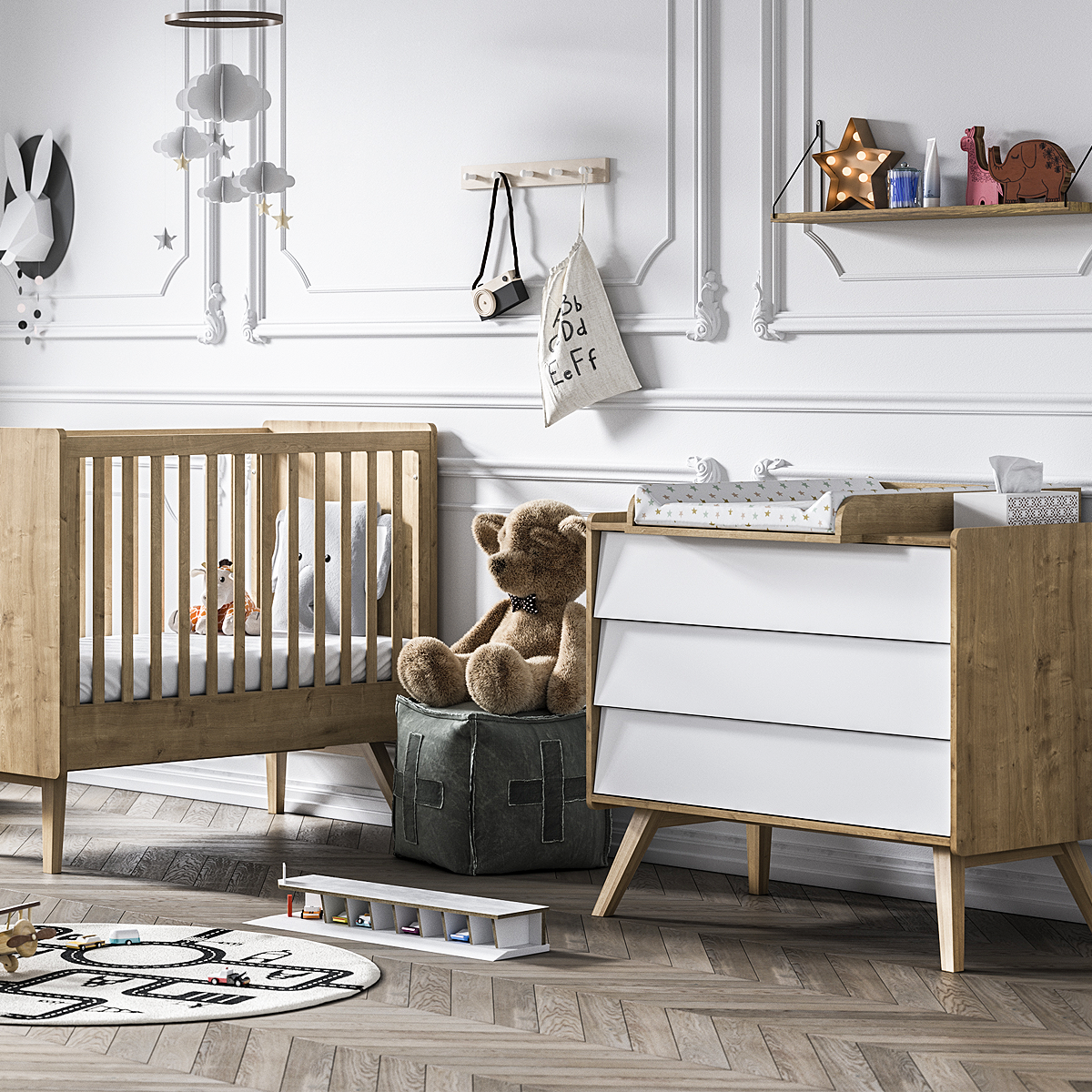 D'un côté, un lit bébé 60x120, réglable en hauteur sur 3 niveaux et, de l'autre, une commode à langer, le tout signé de la marque Vox dans un style retro rappelant ces meubles traditionnels des années 1950.