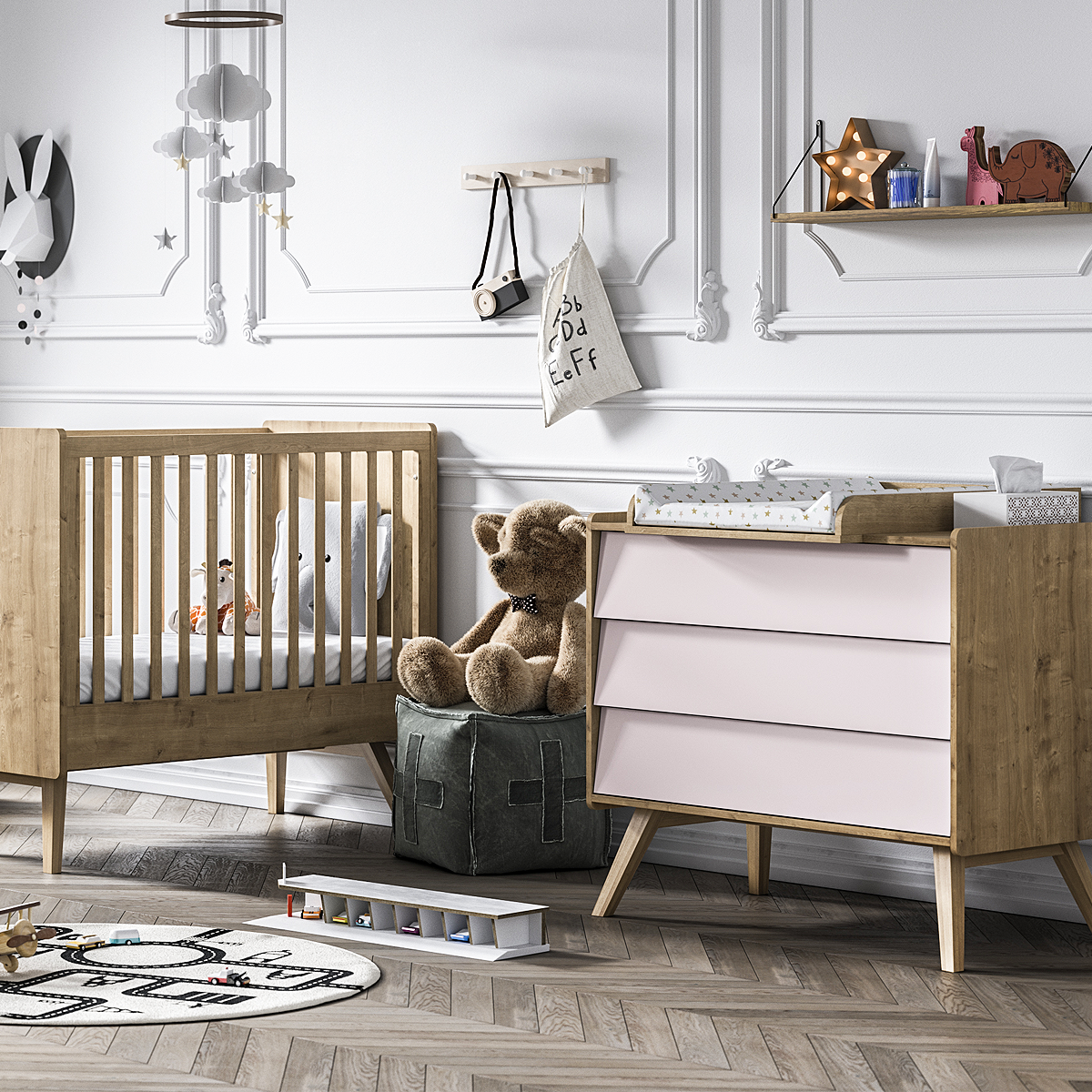 Composé d'un lit bébé 60x120 ainsi que d'une commode à langer, le pack 2 pièces Vintage, de fabrication 100% Européenne, possède un design qui rappellera ce charme particulier et indémodable des années 1950.