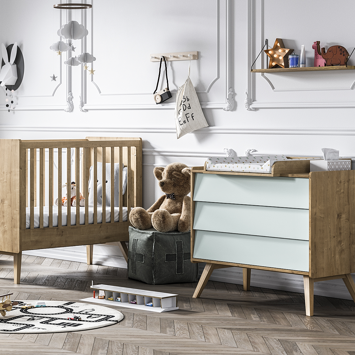 Provenant de la collection Vintage by Vox, le pack 2 pièces est composé, ici, d'un lit bébé 60x120 ainsi que d'une commode à langer, le tout de fabrication 100% Européenne et dans un style retro vintage des années 1950.