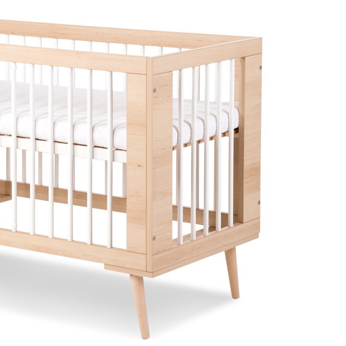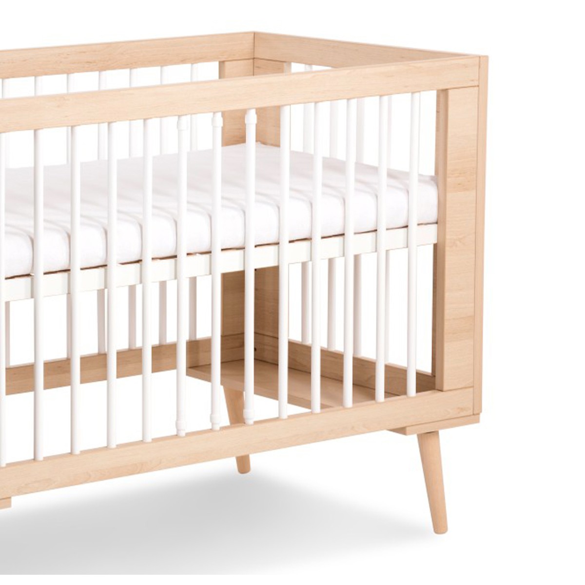 | Plus produit | Lit à barreaux avec pieds en hêtre. Sommier réglable sur 3 hauteurs différents pour suivre la croissance. |