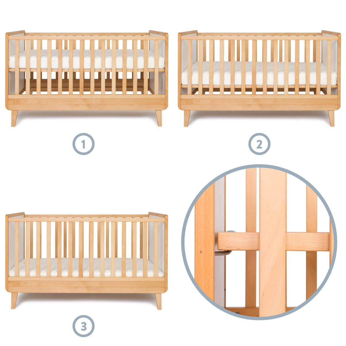 Ce lit bébé est parfait dès la naissance : le sommier se règle en 3 hauteurs (53,5 cm, 38,5 cm puis 22,5 cm). Ensuite il est possible de retirer 2 barreaux pour permettre à votre enfant de sortir et entrer dans son lit seul.
