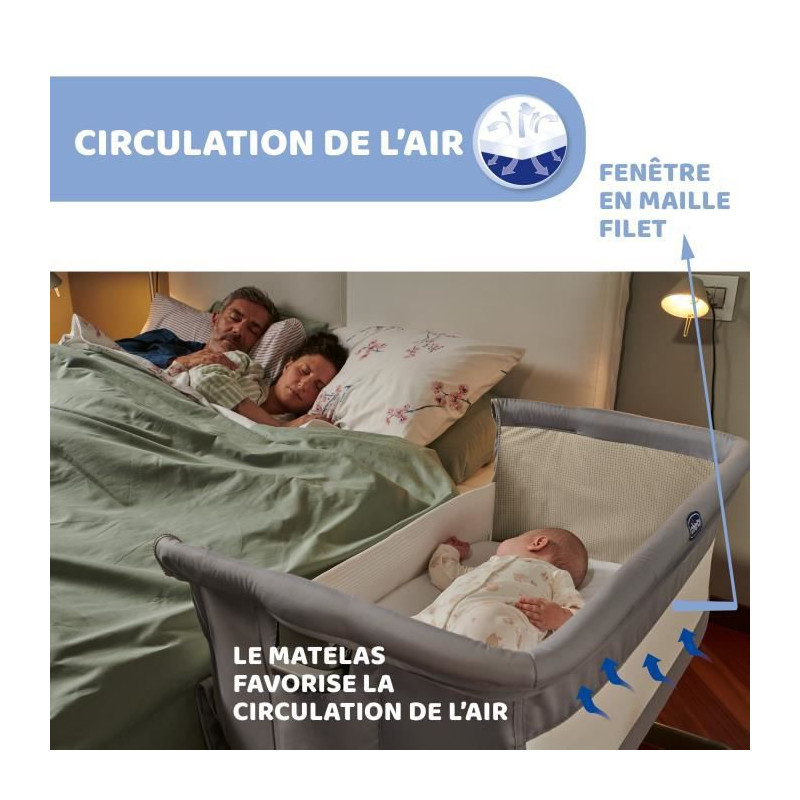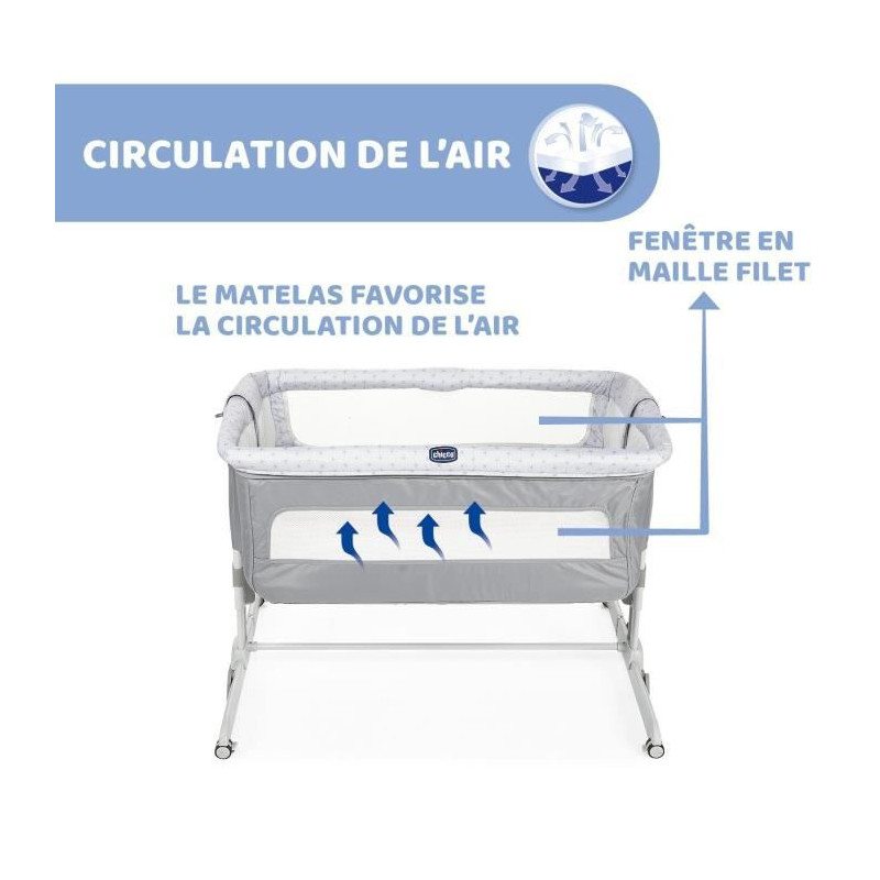 Chicco Next2Me est le berceau cododo de Chicco qui permet a bébé de dormir près de vous pendant la nuit tout en ayant son propre berceau pour plus de sécurité. Avec le berceau Chicco Next2Me, vous passerez des nuits paisibles aux côtés de bébé et pourrez le bercer ou le nourrir facilement chaque fois qu’il se réveillera. Le lien entre bébé et ses parents sera ainsi renforcé et les nuits seront plus sereines ! L'installation est simple et sûre grâce aux 2 sangles permettant de fixer la base du berceau à la structure du lit parental. Le berceau peut aussi être ajusté en hauteur sur 6 positions différentes pour s'adapter à la hauteur du lit des parents. Les pieds sont rétractables pour une compatibilité avec tous les lits, même ceux avec tiroirs. Le berceau est équipé d'un matelas moelleux, très confortable pour bébé et d'une fenêtre en maille filet pour une aération optimale. Il peut être légèrement incliné pour facilité la digestion de bébé.