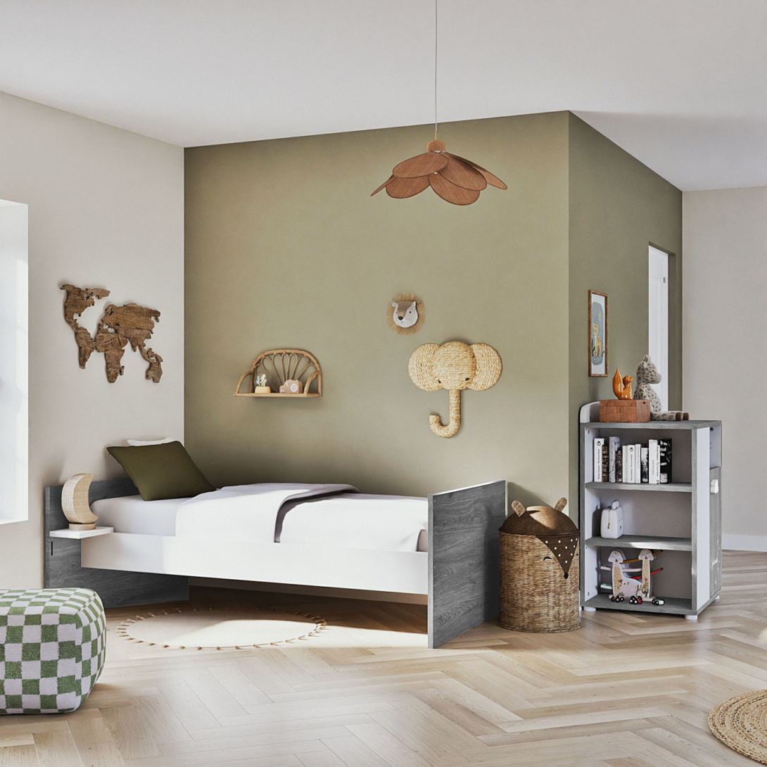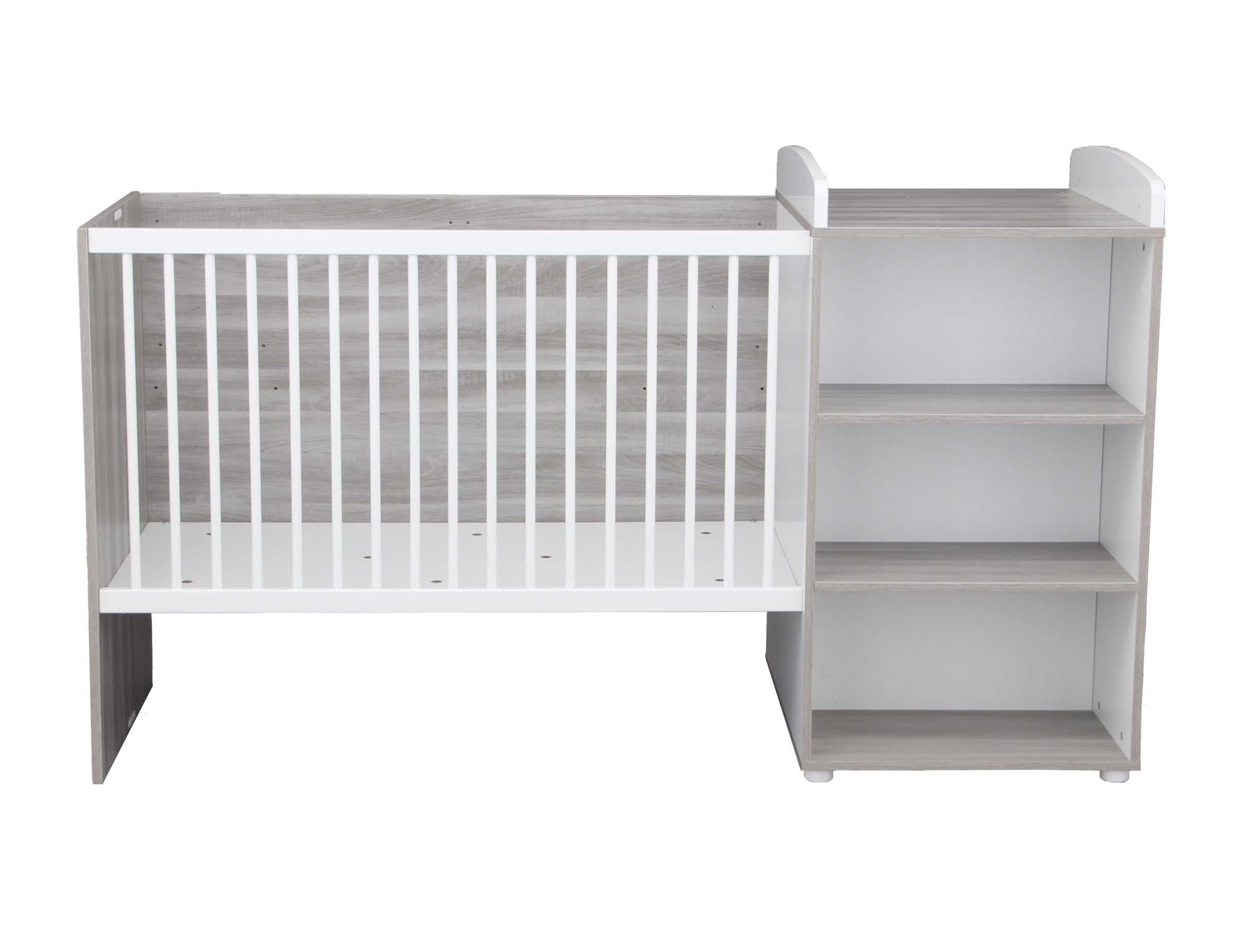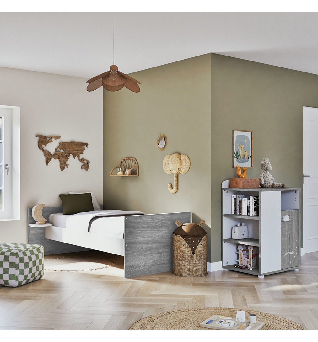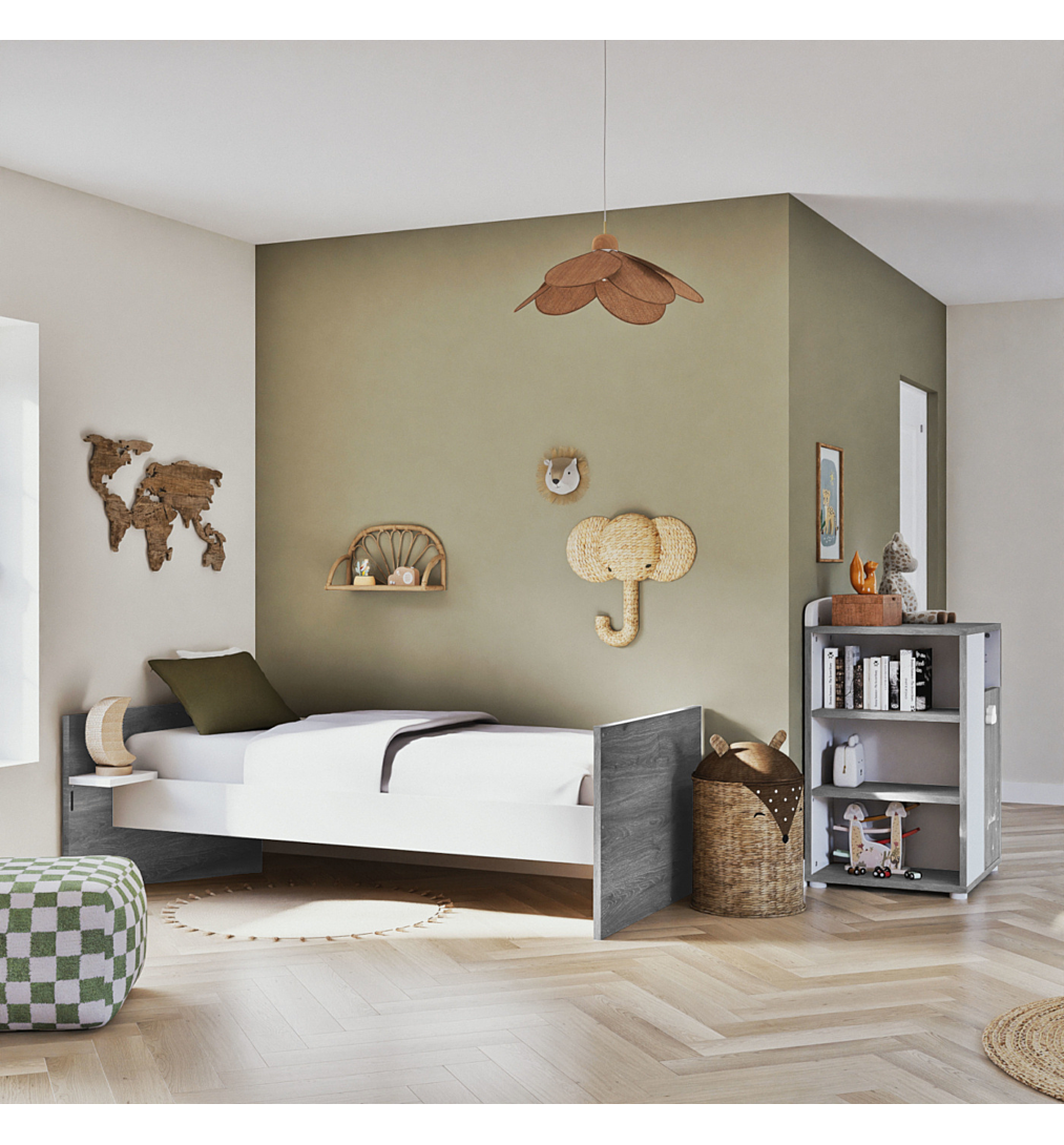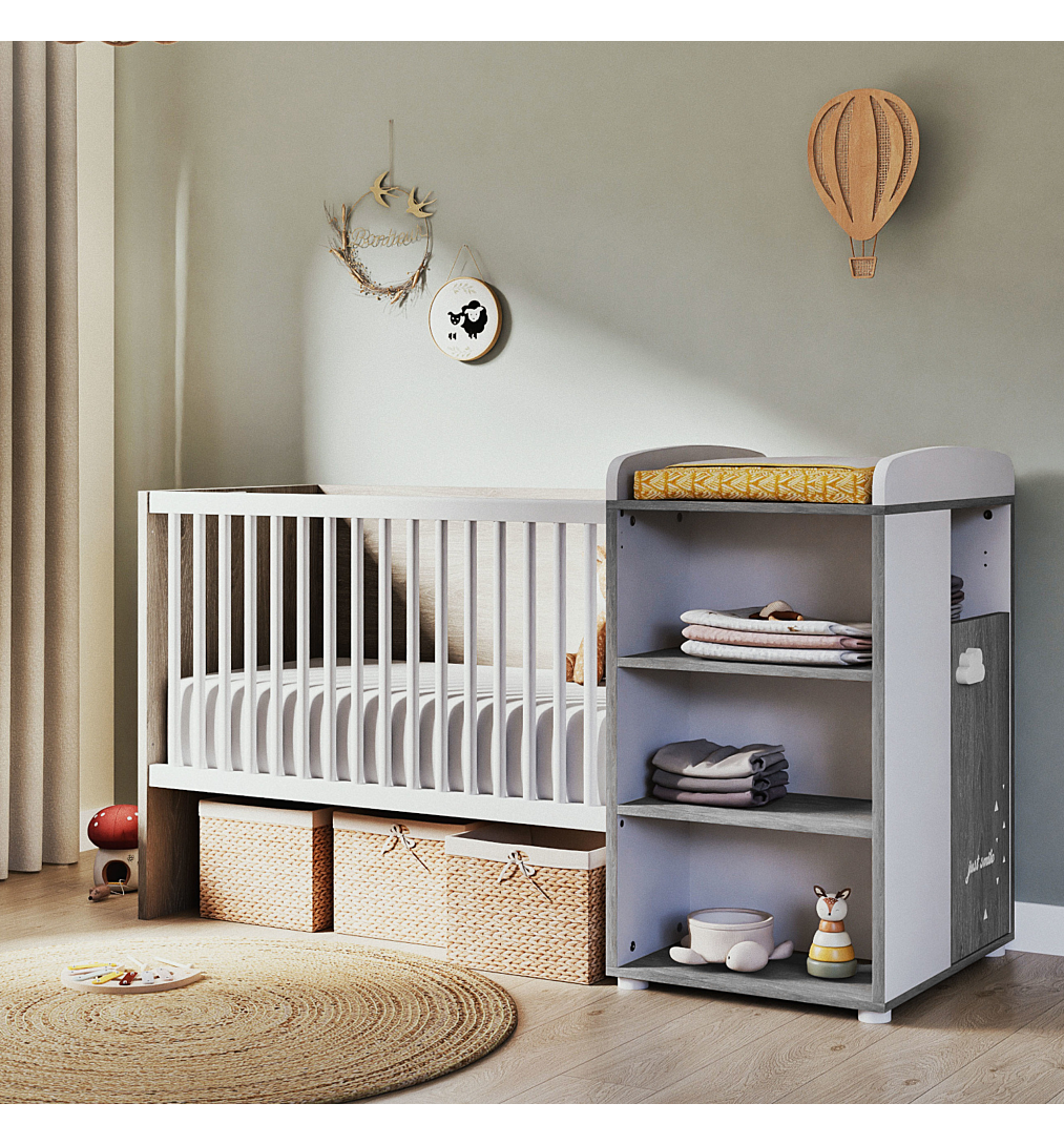 Lit bébé combiné 120x60 évolutif en 90x190 - Chêne Silex - Collection Smile: Une collection mixte aux tons Chêne Silex et blanc. Boutons nuage et décor "Just Smile" par sérigraphie, pour que bébé s'endorme en toute sérénité ! 2 galeries fixes. Sommier réglable en hauteur 3 positions. Le lit bébé 120x60 et la commode à langer peuvent être utilisés soit en bloc compact, soit dissociés l'un de l'autre (attention : la commode utilisée séparément n'est pas un meuble à langer). L'ensemble se transforme en chambre junior : commode + lit 90x190 grâce aux longpans de transformation inclus. Assorti à l'armoire 2 portes référence SX191. Garanti sans solvant. Panneaux garantis avec une teneur en formaldéhydes <=8 mg. Fabrication française. Dimensions: L 179 x H 106 x P 71 Meuble à monter soi-même