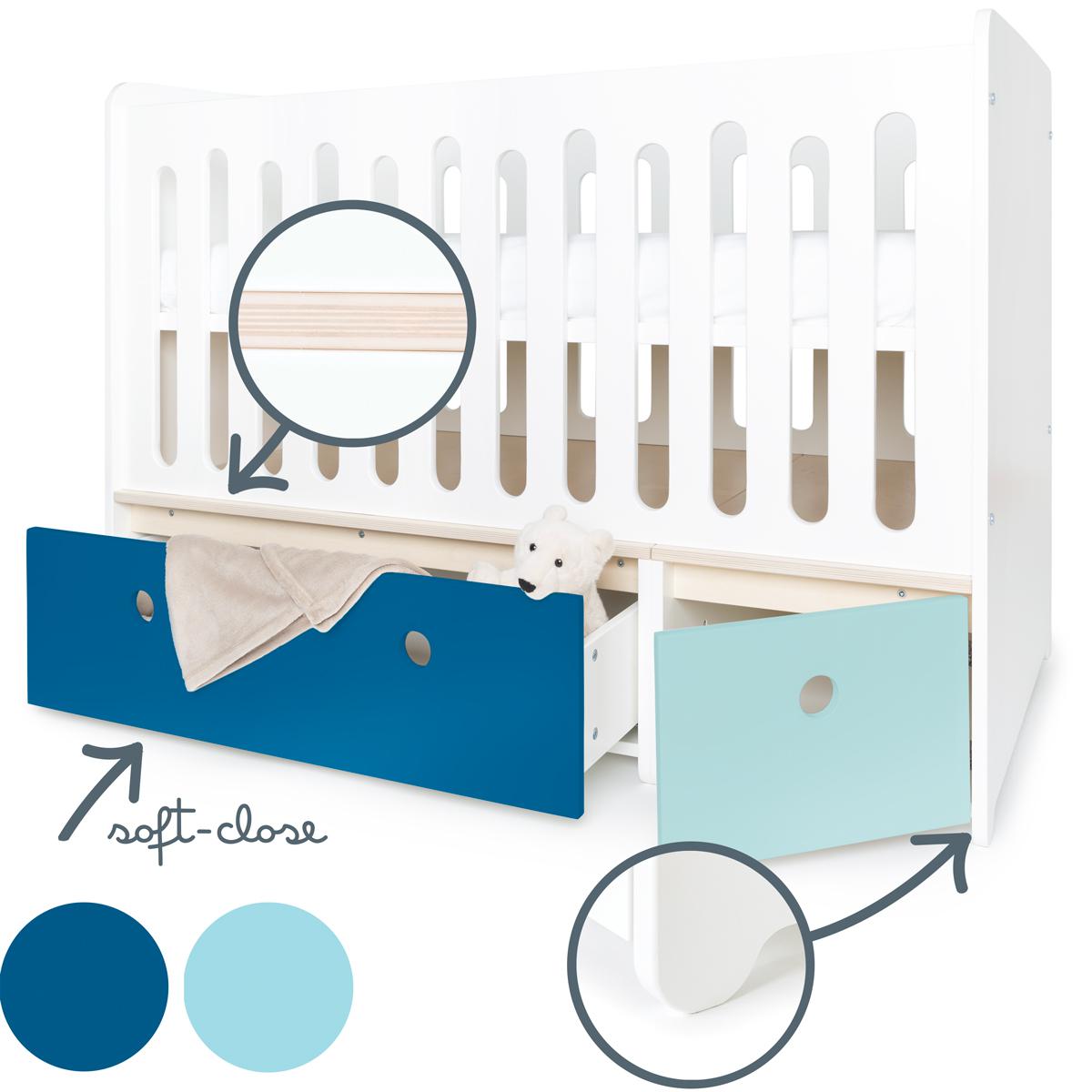 Le lit bébé évolutif COLORFLEX est équipé d'un tiroir avec le système de fermeture “Soft Close” (doux et silencieux) et d''une petite niche de rangement, idéale pour les accessoires de votre bébé.