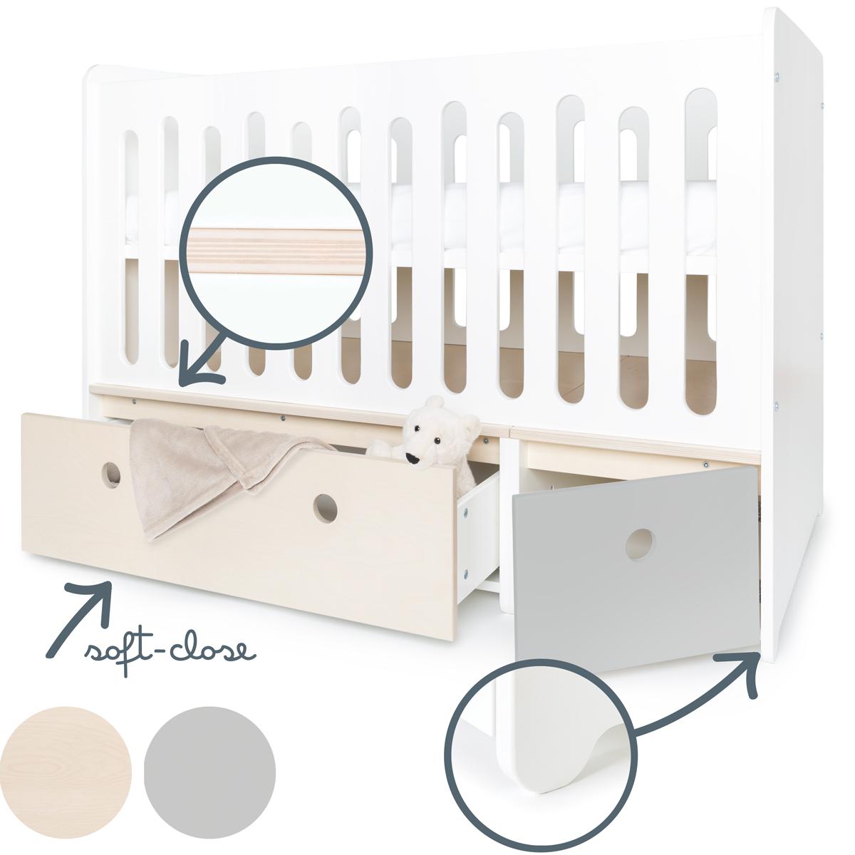 Le lit bébé évolutif COLORFLEX est équipé d'un tiroir avec le système de fermeture “Soft Close” (doux et silencieux) et d''une petite niche de rangement, idéale pour les accessoires de votre bébé.