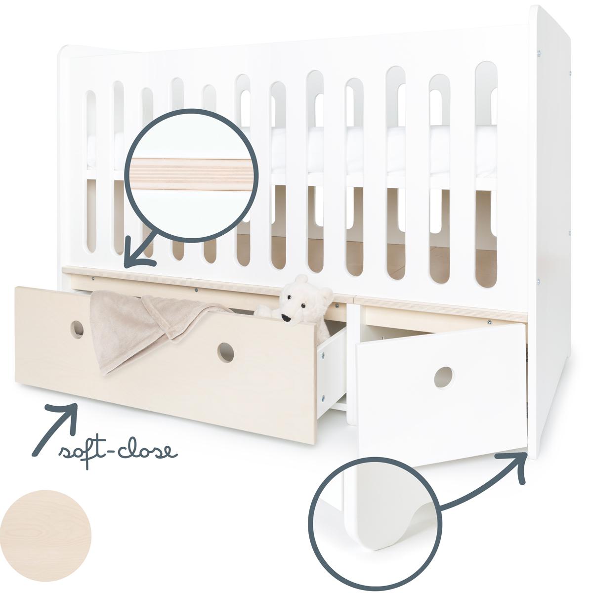 Le lit bébé évolutif COLORFLEX est équipé d'un tiroir avec le système de fermeture “Soft Close” (doux et silencieux) et d''une petite niche de rangement, idéale pour les accessoires de votre bébé.
