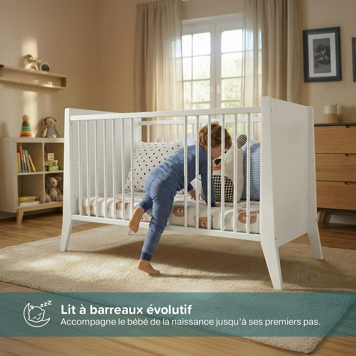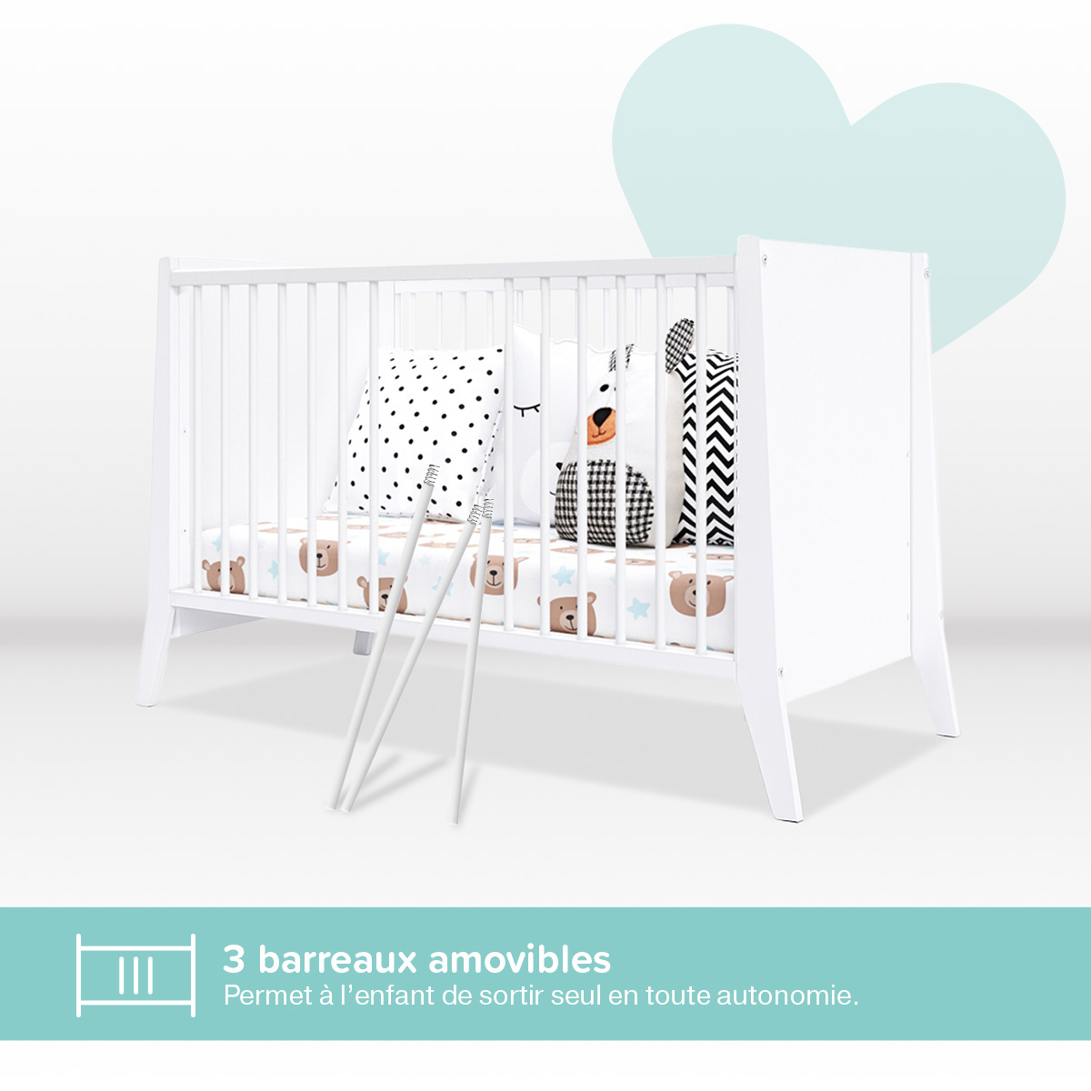 - Barreaux amovibles : Quand il grandira, cette fonction permettra à votre petit bout de chou de monter et descendre librement du lit pour explorer le monde extérieur.