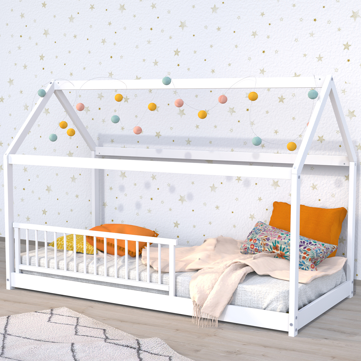Original, lit cabane 90x190, avec barrière amovible et sommier inclus, Panda. Cosy et sécuritaire, en blanc pour fille ou garçon.