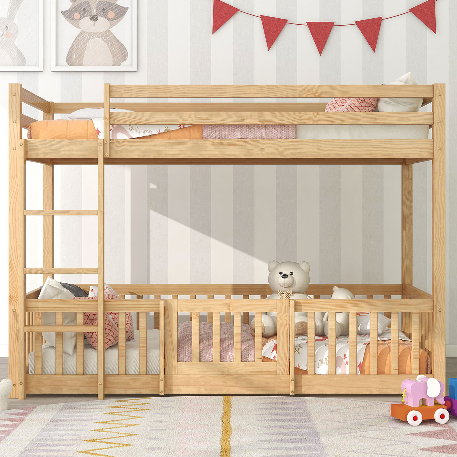 Le lit inférieur est entouré de tous les côtés par des clôtures et possède une porte qui s'ouvre au milieu. Vous pouvez ainsi créer un espace de jeu mystérieux et amusant pour votre enfant sous le lit. Un design sûr et amusant.