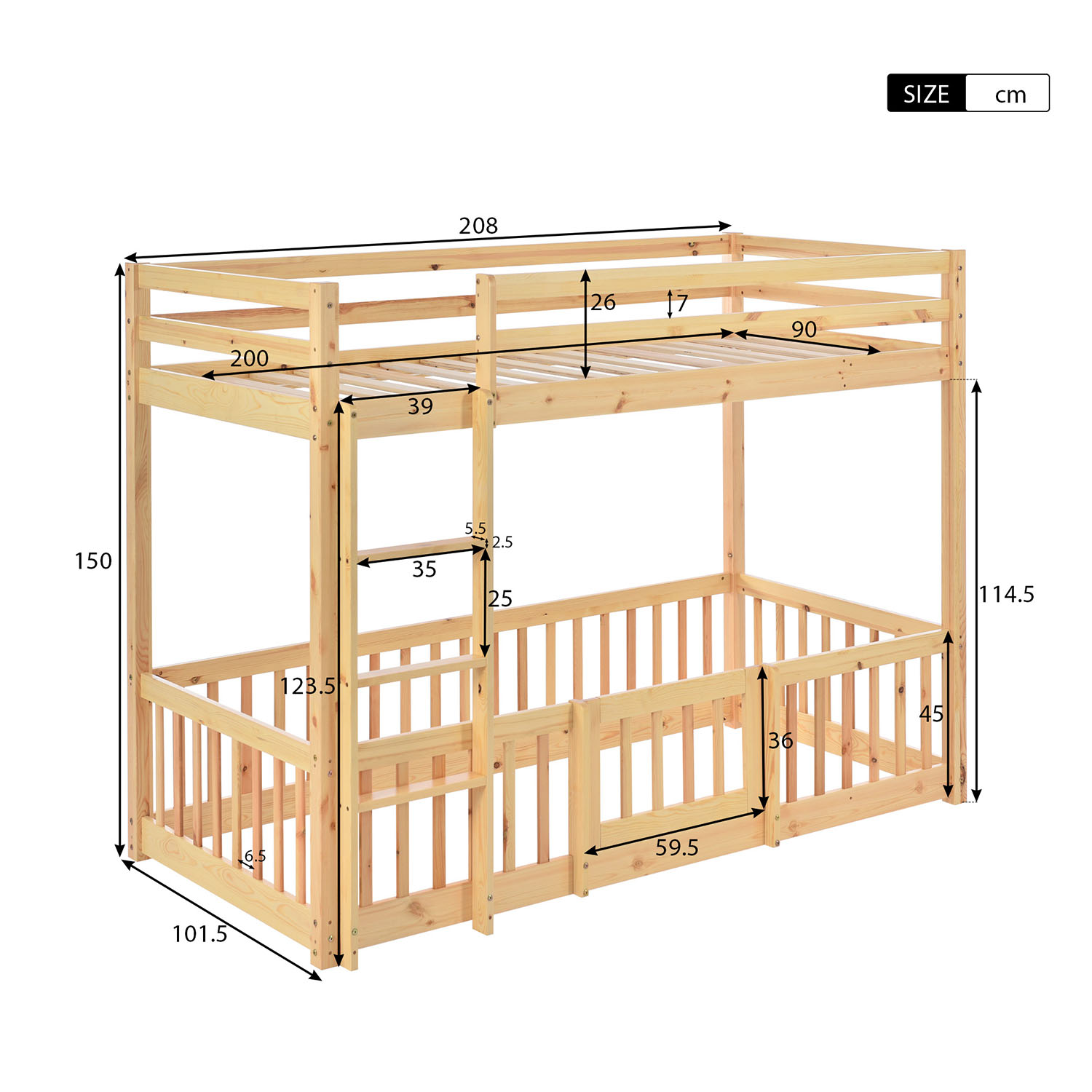 | Libellé | Lit cabane avec barrières et petites portes lit d'enfant naturel (200x90 cm) |
