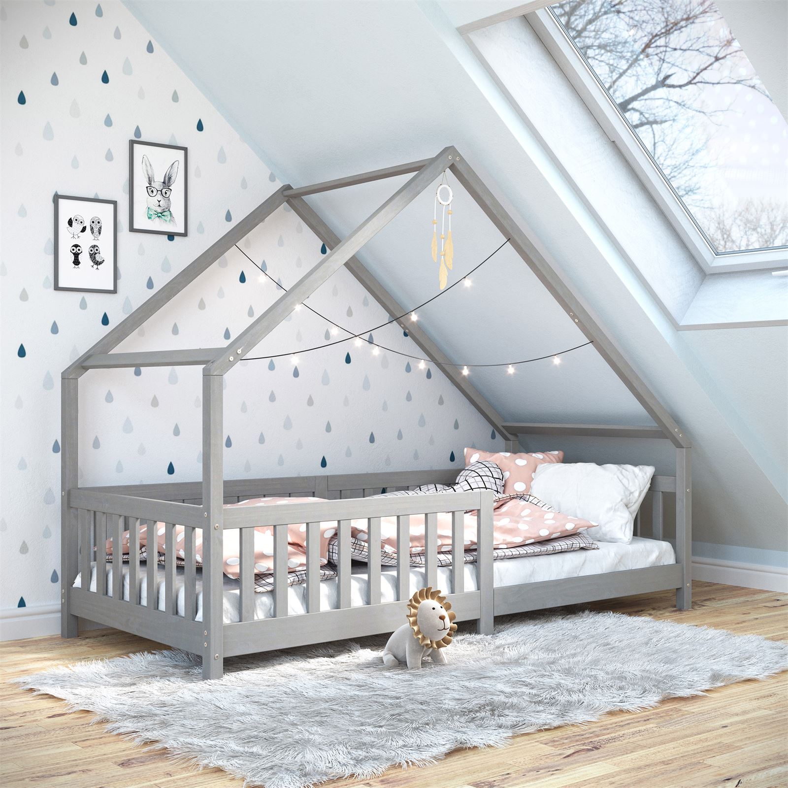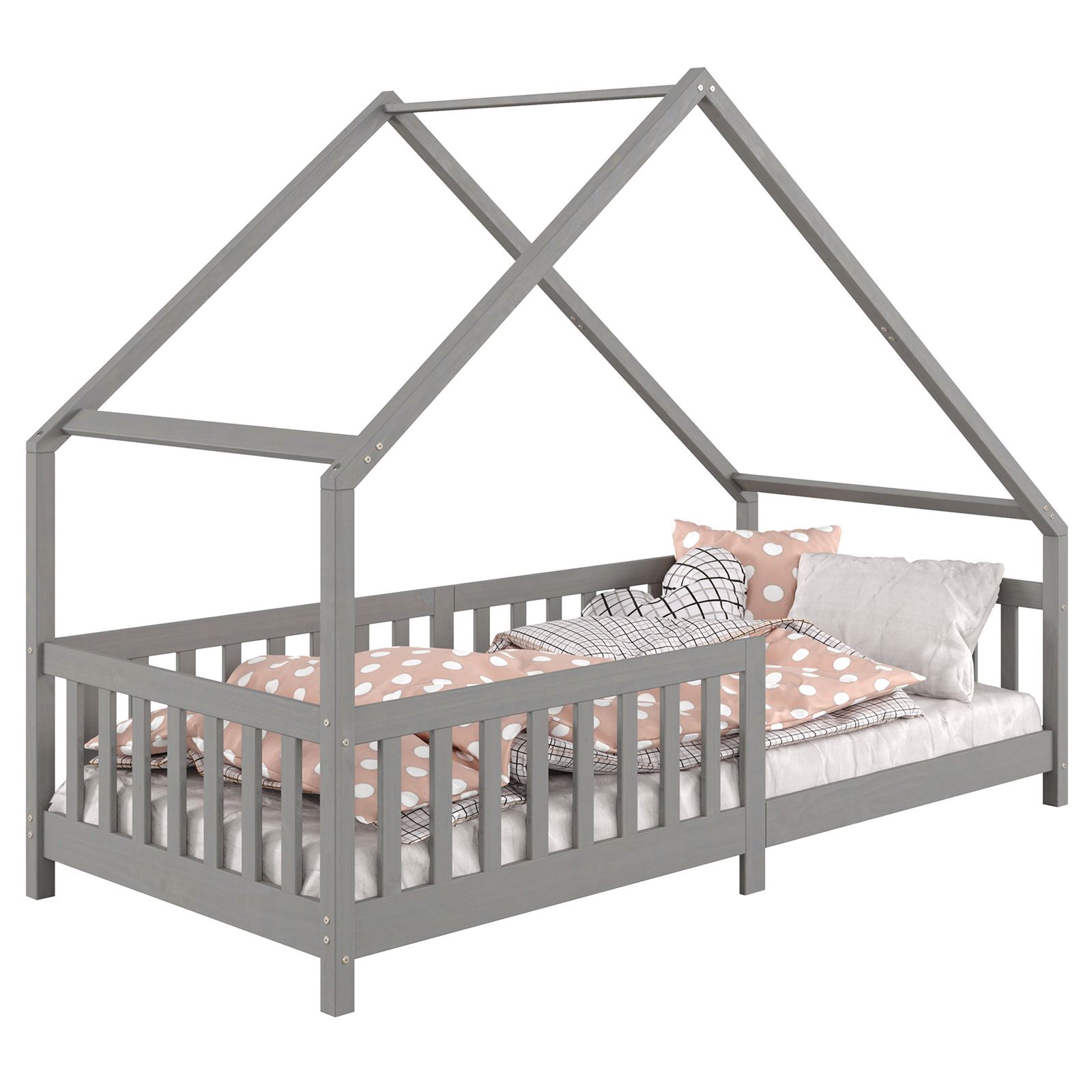 Lit cabane CORA lit enfant simple montessori asymétrique en bois 90 x 190 cm en pin massif lasuré gris