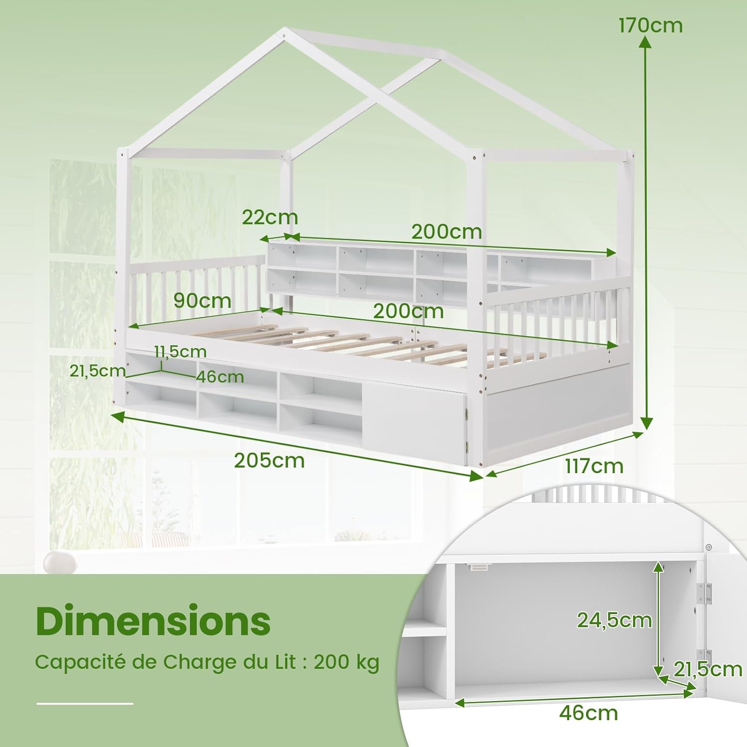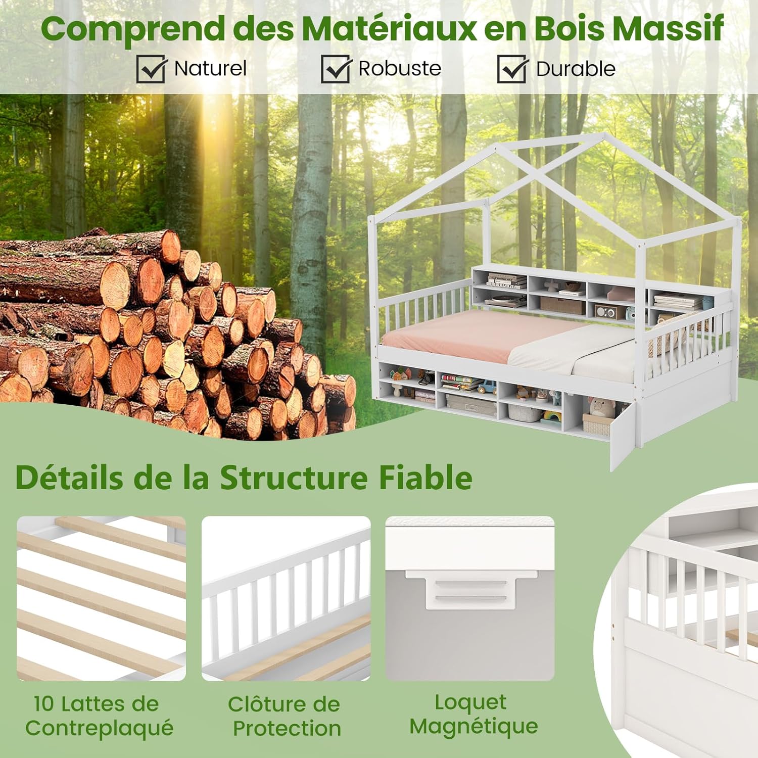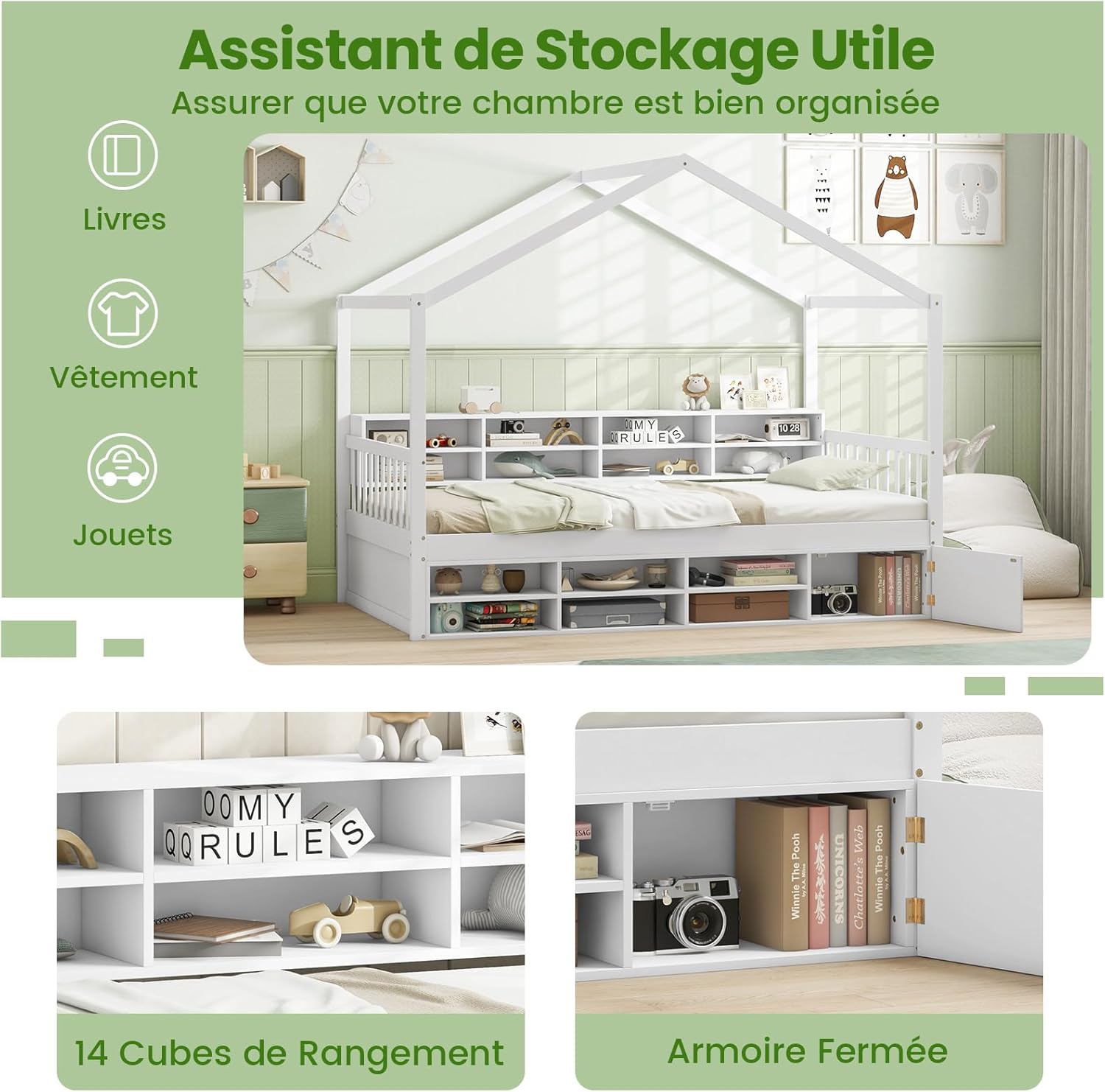 | Libellé | Lit Cabane Enfant, Cubes de Rangement, Armoire avec Porte, Protection Contre Les Chutes, Lit avec Toit |