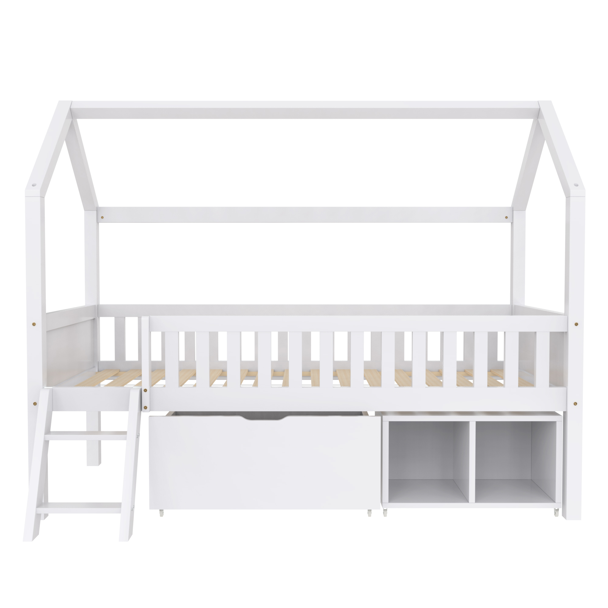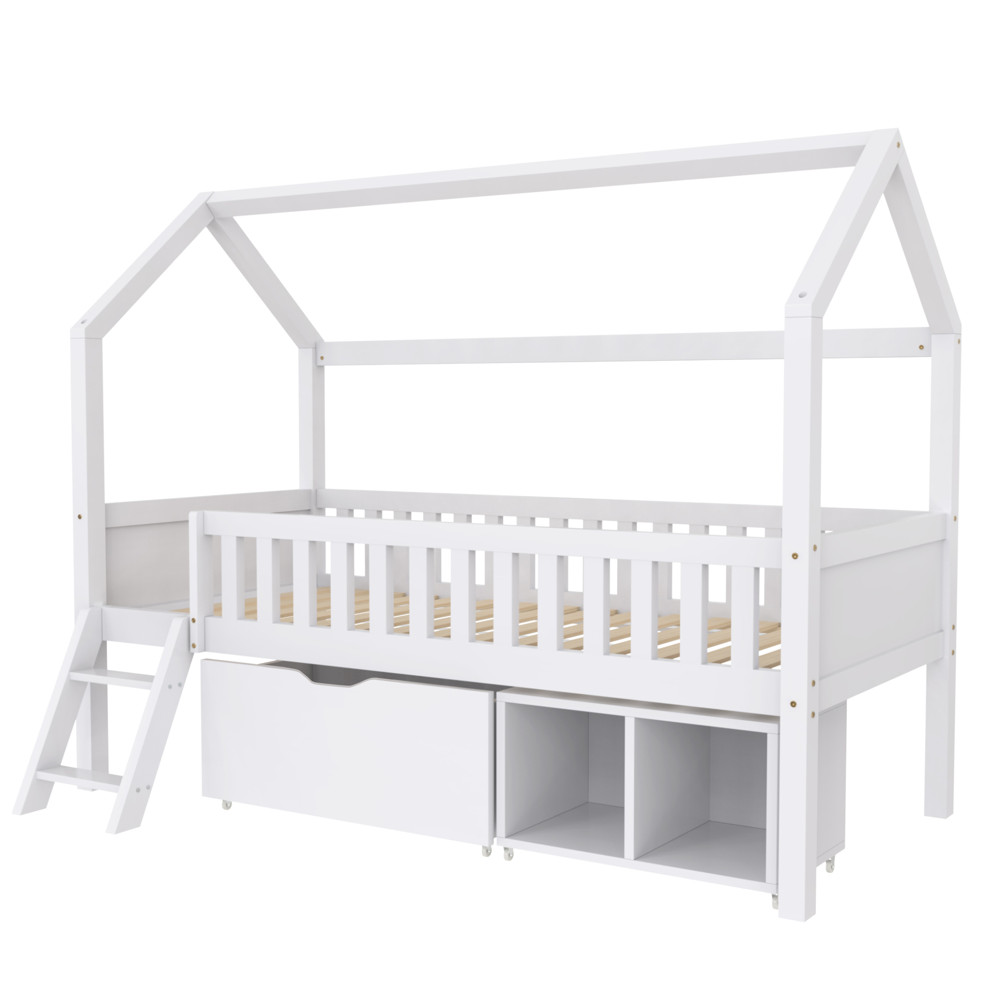 | Libellé | Lit Cabane Enfant Mi-haut 90x200cm, Lit Simple avec Rangement et Sommier, Tiroirs, Escalier et Barrières – en Bois Blanc |