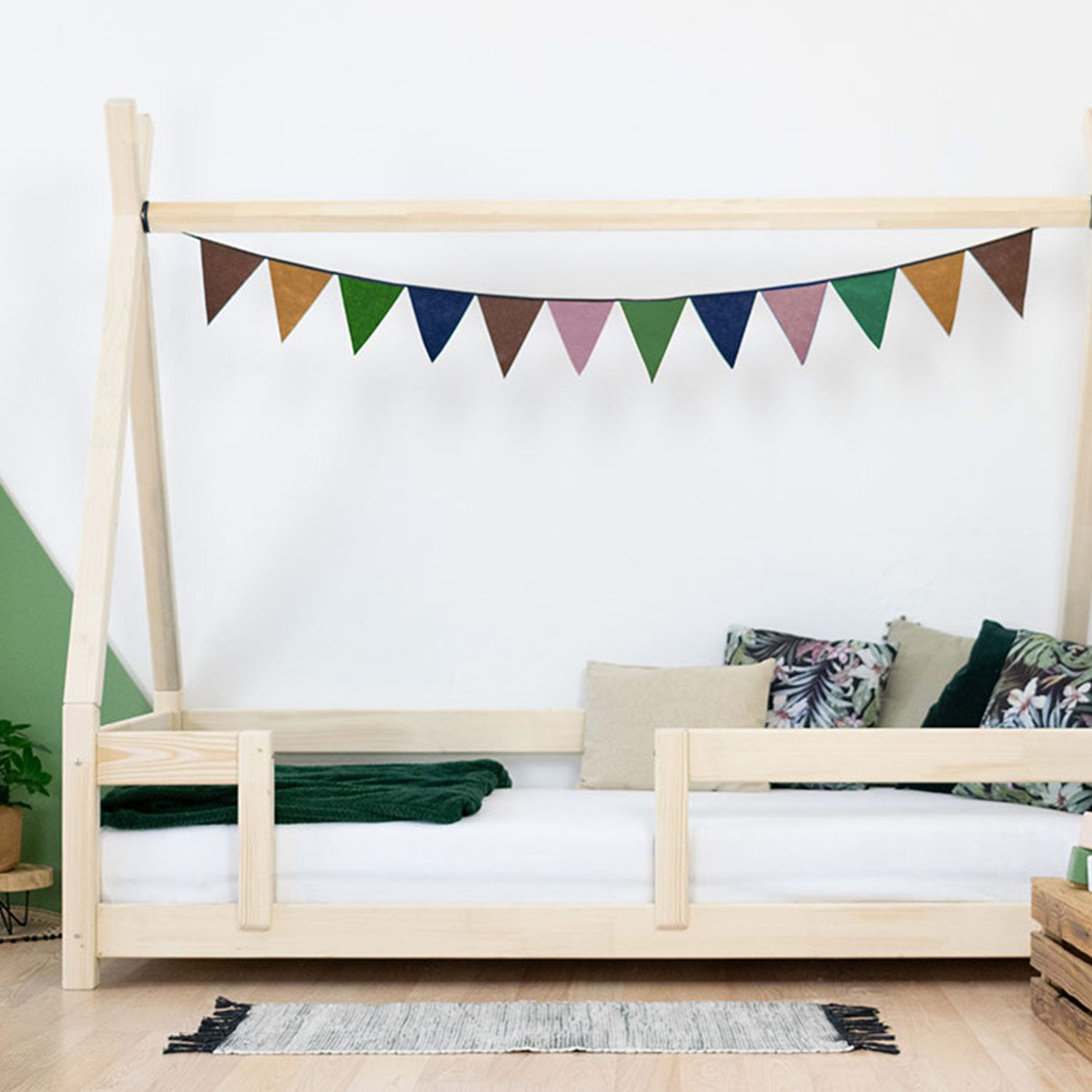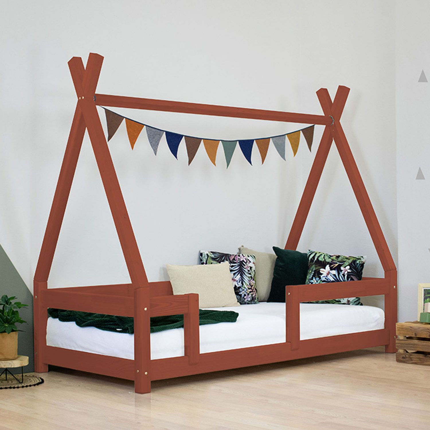 Ce lit Tipi “NAKANA” permet à votre enfant de gagner en autonomie en toute sécurité ! Fabriqué à la main en Europe, ce lit est à quelques cm du sol pour que votre enfant puisse aller et venir dans son lit facilement et permettre à l'air de circuler. Le sommier du lit vous est offert avec la structure du lit. Le lit a une capacité de charge de 150 kg, idéal pour pouvoir lire l'histoire du soir sous le toit du tipi. Existe en 12 coloris (blanc, verni, beige, gris clair, gris foncé, vert sauge, rose pastel, rouge brique, bleu marine, vert pétrole, bleu clair, non verni) et en 10 dimensions pour s'adapter à l'âge de votre enfant (70x160 cm, 80x160 cm, 80x180 cm, 90x160 cm, 90x180 cm, 90x190 cm, 90x200 cm, 120x180 cm, 120x190 cm, 120x200 cm, 140x200 cm). Couleurs 100% naturelles, anti-allergiques . Un matelas entre 15 et 23 cm d'épaisseur (120 x 180 cm) est recommandé. Le matelas n'est pas fourni. Benlemi est une entreprise familiale spécialisée dans le mobilier en bois et notamment l'équipement des chambres d'enfant. Cette entreprise européenne dessine et fabrique dans sa propre usine de fabrication les produits proposés. Le design des lits et accessoires est pensé dans une philosophie Montessori. Le vernissage est fait à la main avec des peintures 100% naturelles et anti-allergiques. Le bois utilisé est tracé et rigoureusement sélectionné et la chaîne de fabrication est labellisée PEFC. Produit à monter soi-même. Un manuel de montage est disponible. Possibilité d'ajouter des pieds supplémentaires FOOTS ou un tiroir BUDDY. Garanti 5 ans. Dimensions totales du lit : 161 x 89 x 169 cm (hauteur x largeur x longueur). Des délais de fabrication et de livraison peuvent intervenir. Couleur : rouge brique.