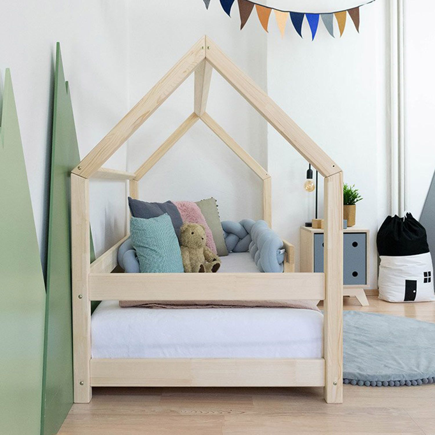 Ce lit Montessori “TERY” permet à votre enfant de gagner en autonomie en toute sécurité ! Fabriqué à la main en Europe, ce lit est à 6 cm de hauteur du sol pour que votre enfant puisse aller et venir dans son lit facilement et permettre à l'air de circuler. Le sommier du lit vous est offert avec la structure du lit. Le lit a une capacité de charge de 150 kg, idéal pour pouvoir lire l'histoire du soir sous le toit du tipi. Existe en 12 coloris (blanc, verni, beige, gris clair, gris foncé, vert sauge, rose pastel, rouge brique, bleu marine, vert pétrole, bleu clair, non verni) et en 10 dimensions pour s'adapter à l'âge de votre enfant (70x160 cm, 80x160 cm, 80x180 cm, 90x160 cm, 90x180 cm, 90x190 cm, 90x200 cm, 120x180 cm, 120x190 cm, 120x200 cm, 140x200 cm). Couleurs 100% naturelles, anti-allergiques . Un matelas entre 15 et 18 cm d'épaisseur (120 x 180 cm) est recommandé. Le matelas n'est pas fourni. Benlemi est une entreprise familiale spécialisée dans le mobilier en bois et notamment l'équipement des chambres d'enfant. Cette entreprise européenne dessine et fabrique dans sa propre usine de fabrication les produits proposés. Le design des lits et accessoires est pensé dans une philosophie Montessori. Le vernissage est fait à la main avec des peintures 100% naturelles et anti-allergiques. Le bois utilisé est tracé et rigoureusement sélectionné et la chaîne de fabrication est labellisée PEFC. Produit à monter soi-même. Un manuel de montage est disponible. Garanti 5 ans. Dimensions totales du lit : 160 x 89 x 189 cm (hauteur x largeur x longueur). Des délais de fabrication et de livraison peuvent intervenir. Couleur : gris clair.