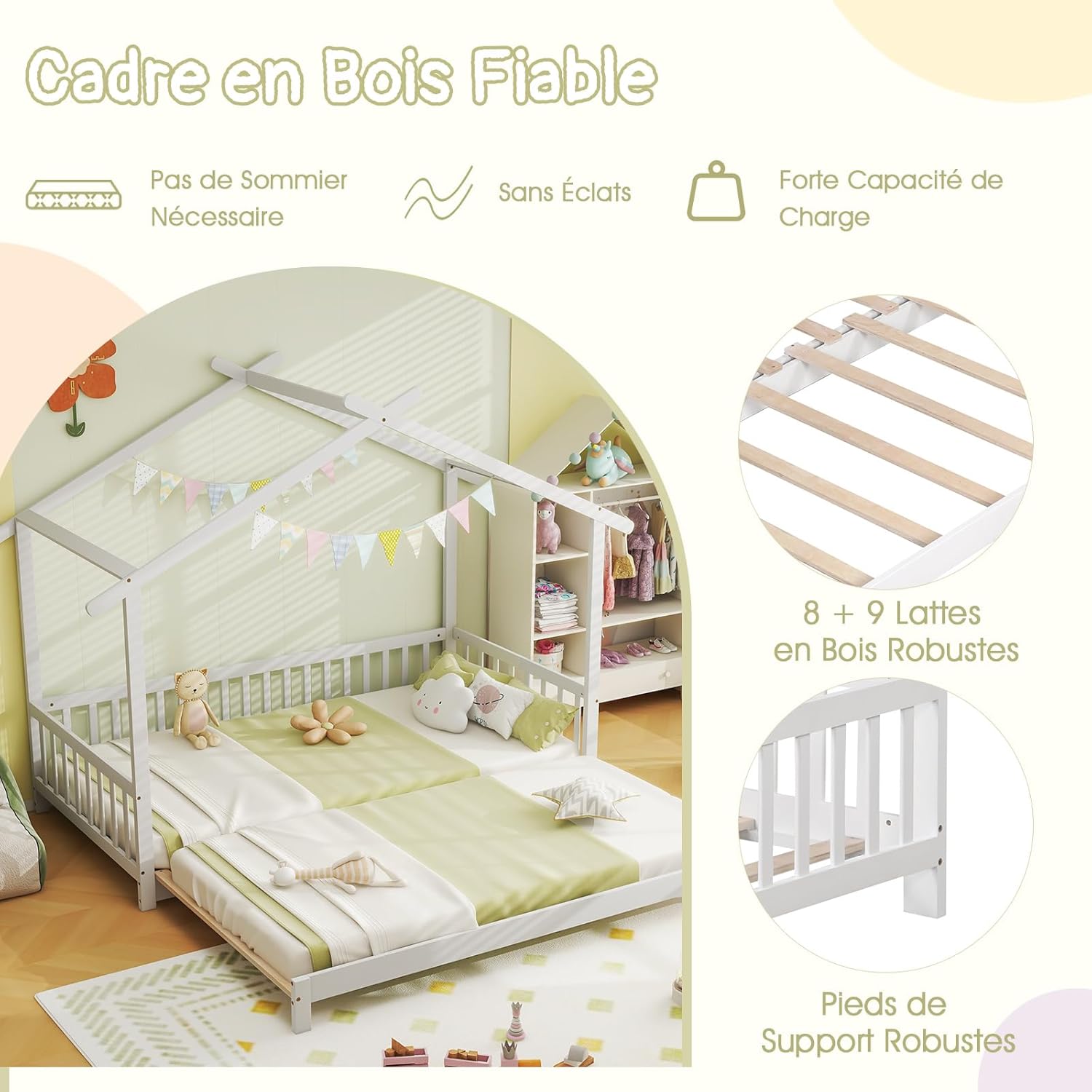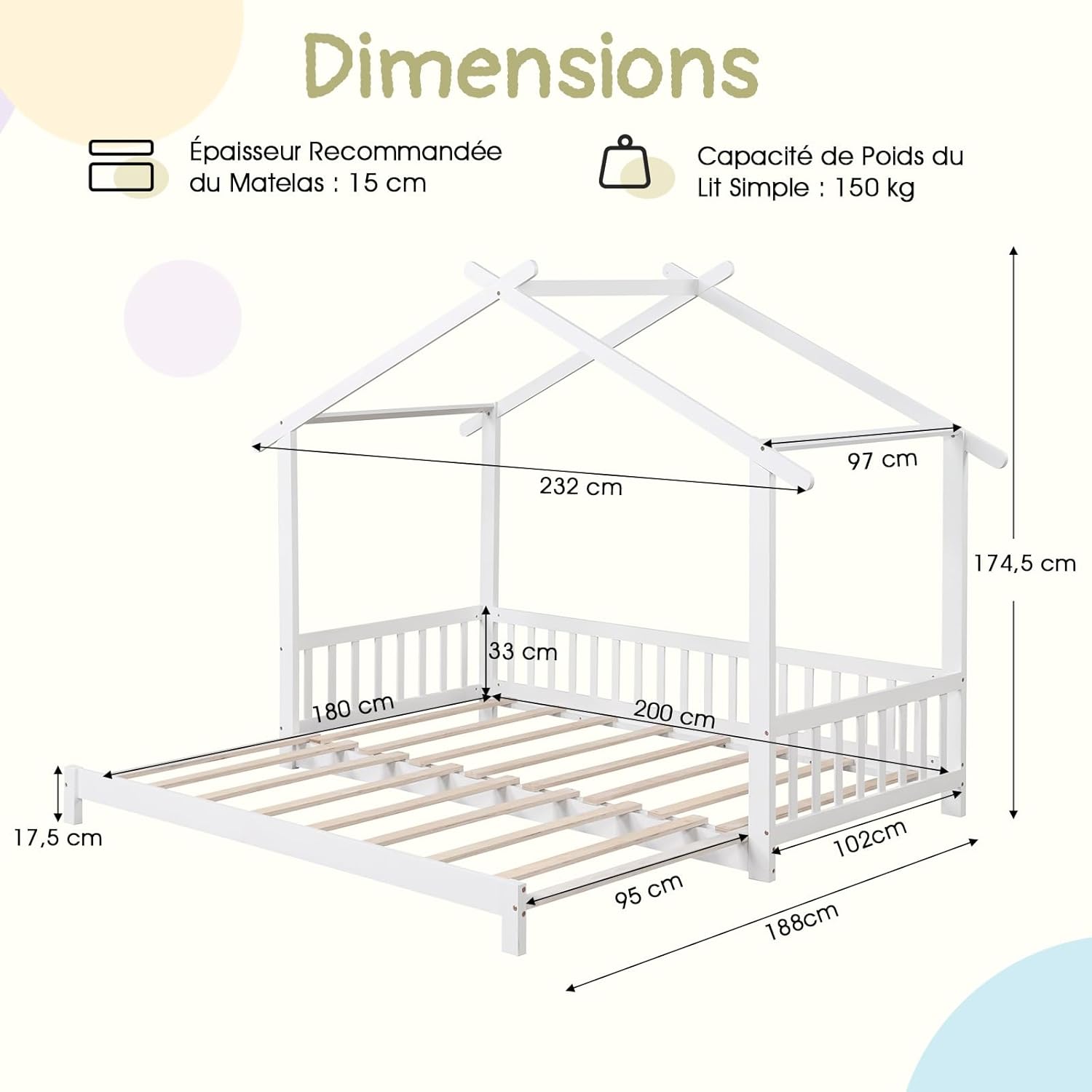 - Sécurité Excellente : Priorisant la sécurité de votre enfant, le lit de maison avec toit présente un design bas au sol, garantissant un environnement de sommeil sécurisé. En outre, grâce à la clôture, il dispose d'une structure semi-fermée qui assure une grande sécurité.