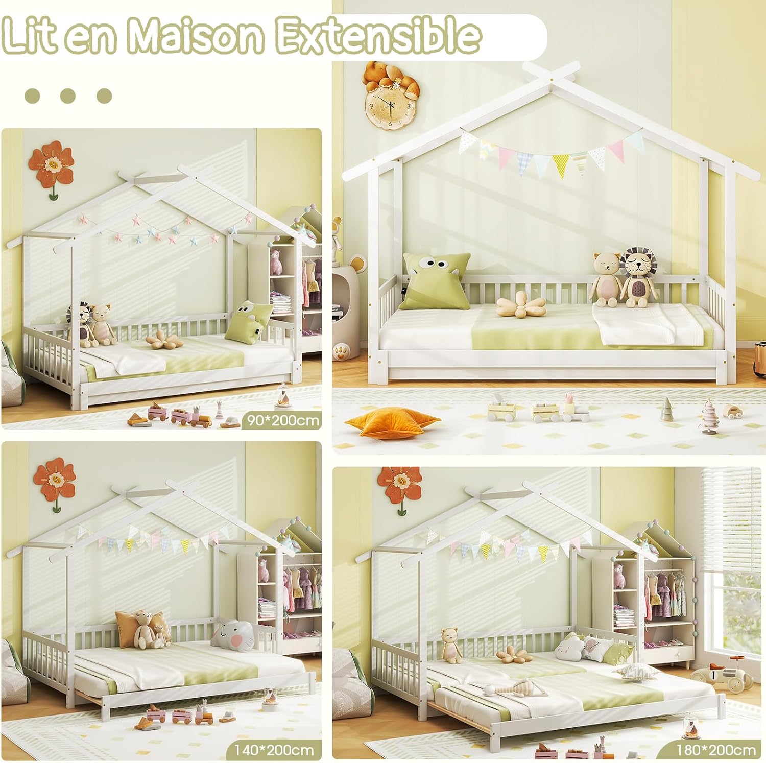 | Libellé | Lit cabane enfants lit enfants 2 place plateforme extensible, lit jumeuax clôture,design bas au sol,blanc |