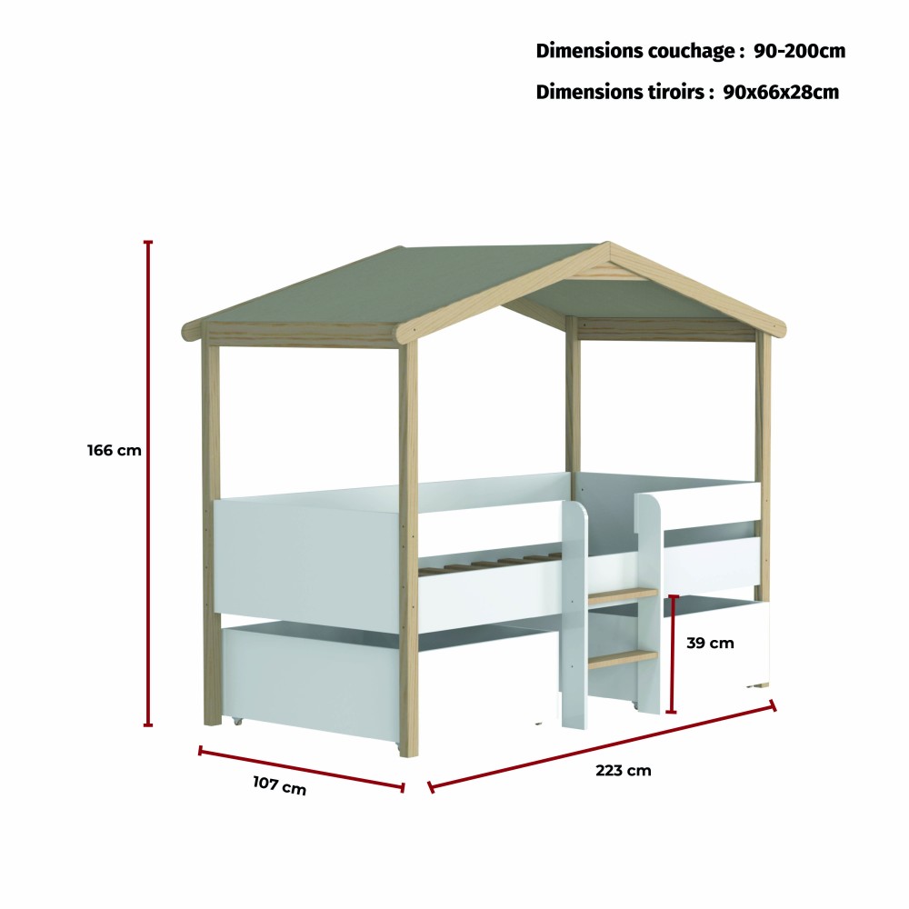 Lit Cabane PILOTI 90 x 200 cm + 2 tiroirs + sommier Le lit cabane PILOTI s'adaptera parfaitement à l'espace de votre enfant et est un élément de décoration incontournable pour sa chambre. Grâce notamment à son toit amovible en toile polyester, le lit PILOTI est une véritable cabane de petit aventurier ! Votre enfant à la possibilité de laisser libre cours à son imagination et de se créer son propre univers dans lequel il pourra jouer, rire et faire de beaux rêves. Astucieux, il possède également deux grands tiroirs de rangement montés sur roulettes très pratique pour ranger jouets et linge de lit en un clin d'œil.Points forts:- 1 sommier et 2 tiroirs inclusCaractéristiques : Structure en hêtre ou tilleul massif naturel, MDF et panneau de particules blancColoris : Blanc et Bois naturelSommier 13 lattes.Dimensions hors tout (en cm) : 166 x 107 x 223 Dimension du couchage (en cm): 90 x 200Dimension d'un tiroir (en cm): 90 x 66 x 28.Toit en toile polyester beige pouvant être retirée pour le lavage. * Charge maximale d'utilisation : 80 kg* Conditions d'entretien : Ne pas utiliser de produits abrasif, ni solvant ni diluant.Livré démonté avec sommier à lattes, avec 2 tiroirs, sans matelas ni accessoires de décoration. A monter soi-mêmeDimensions:224x107x166