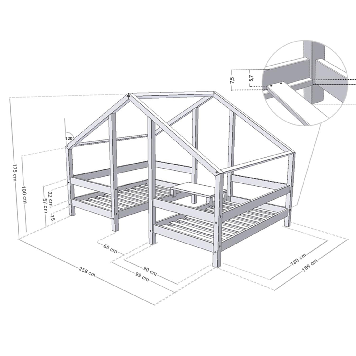 Le lit cabane VILLY englobe deux lits simple pour accueillir deux enfants sous le même toit. Cette conception facilite la communication et le partage dans la fratrie. Ce lit répond à la philosophie Montessori qui consiste à donner à son enfant les outils nécessaires pour qu'il gagne en autonomie en toute sécurité. Fabriqué à la main en Europe en bois massif, ce lit est à 15 cm de hauteur du sol pour que votre enfant puisse aller et venir dans son lit facilement. Une table d'appoint commune et coulissante est incluse : elle fait le lien entre les deux lits et peut tout aussi bien servir de table de chevet que de table de jeux. Le sommier des deux lits vous est offert avec la structure du lit. Chaque lit a une capacité de charge de 150 kg, idéal pour pouvoir lire l'histoire du soir sous le toit de la cabane. Existe en 4 coloris et 4 Dimensions pour s'adapter à l'âge de vos enfants. Un matelas entre 17 et 23 cm d'épaisseur (90 x 180 cm) est recommandé. Le matelas n'est pas fourni. Vous pouvez compléter votre achat avec un matelas ou un tiroir de lit de la marque Benlemi. Benlemi est une entreprise familiale spécialisée dans le moblier en bois et notamment l'équipement des chambres d'enfant. Cette entreprise européenne dessine et fabrique dans sa propre usine de fabrication les produits proposés. Le design des lits et accessoires est pensé dans une philosophie Montessori. Le vernissage est fait à la main avec des peintures 100% naturelles et anti-allergiques. Le bois utilisé est tracé et rigoureusement sélectionné et la chaîne de fabrication est labellisée PEFC. Produit à monter soi-même. Un manuel de montage est disponible. Garanti 5 ans. Dimensions totales du lit : 175 x 258 x 189 cm (hauteur x largeur x longueur) - deux lits de 90 x 180 cm.