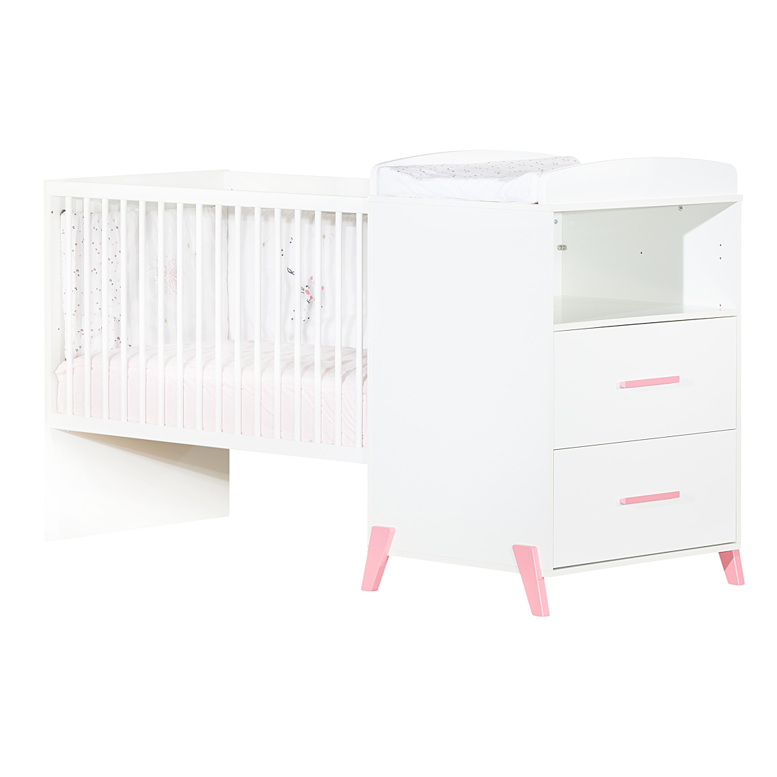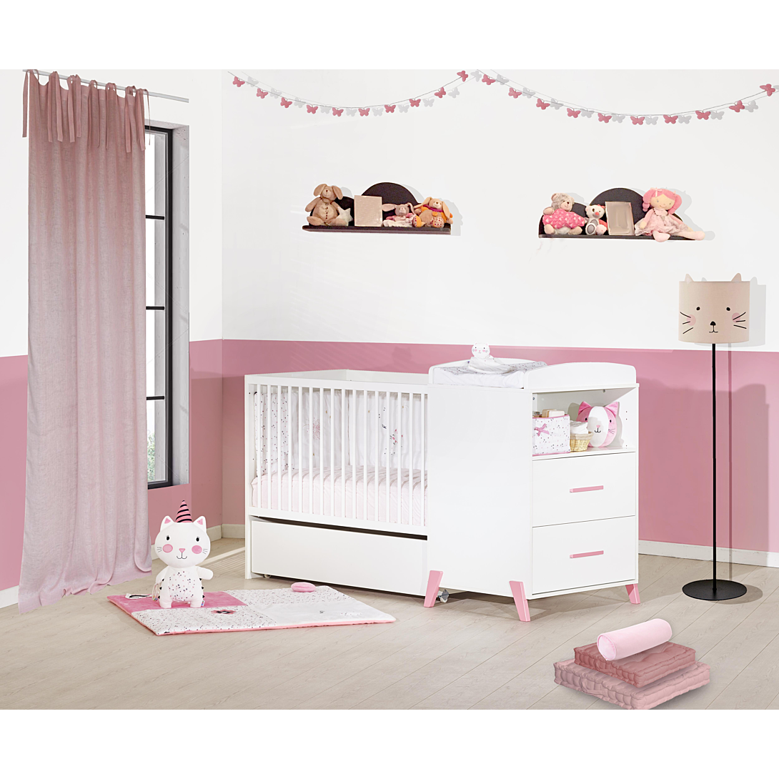 Lit combiné évolutif 120x60 en 90x190 - JOY ROSE Le lit combiné évolutif 120x60 en 90x190 JOY de style scandinave est idéal pour une chambre de bébé tendance avec une touche de couleur. Ce lit combiné évolutif au design simple et moderne suivra votre enfant de sa naissance à son adolescence ! Dès la naissance, votre bébé profitera du confort d'un lit bébé 60x120 cm. Pratique, son sommier est réglable sur 3 positions. Grâce au meuble à langer accolé, vous pourrez lui faire ses soins en toute sécurité en ayant tout à portée de main. Plus tard, cet ensemble se transformera en lit enfant 90x190 cm avec tablette de chevet (sommier vendu séparément), accompagné d'une commode indépendante muni de grands tiroirs et d'une grande niche. Pour une chambre complète, vous pourrez associer à votre lit, l'armoire 2 portes JOY ROSE. Caractéristiques du lit JOY: Partie Commode 2 tiroirs, 1 niche : Dessous, dessus, cotés et 1 tablette niche en panneaux de particules mélaminés décor blanc. Faces tiroirs en panneaux de particules mélaminés décor blanc laqués 1 face blanc. 2 Joues du dispositif à langer en panneaux de fibres moyenne densité (MDF) laquées blanc. 4 pieds et 2 poignées en hêtre laqués rose poudré. Coulisses à billes. Partie Couchage bébé 120x60 : 1 galeries fixe, en hêtre, avec balustres ronds, laquée blanc. 1 panneau galerie et 1 tête de lit en panneaux de particules mélaminés décor blanc. Sommier en hêtre brut réglable 3 positions. Fabrication française Garanti sans solvant Conforme aux normes de sécurité en vigueur Dimensions du lit combiné évolutif: 196 x 107 x 71 cm Commode 2 tiroirs et 1 niche: L76 H97 P71 Couchage: 120x60 cm en version bébé 90x190 cm en version junior