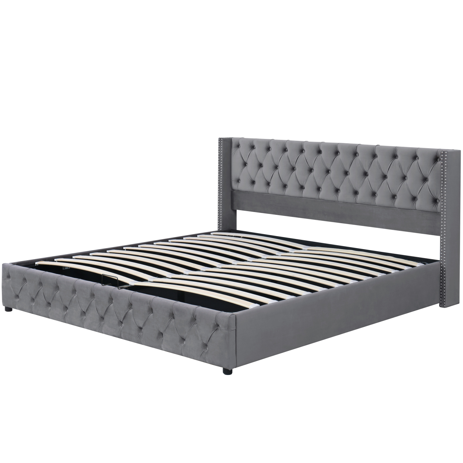 Lit coffre hydraulique 140x190 cm, lit 2 place pour adulte, design rivet, Espace de rangement extra large, lit rembourré avec fond, Cadre en fer, lattes en bois, peut supporter 300 kg, Tissu en velours, doux pour la peau et confortable, Gris, sans matelas.