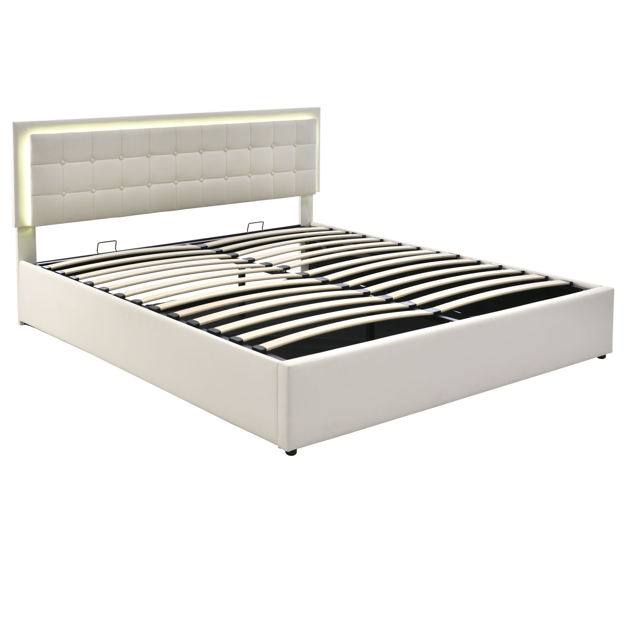 Lit Coffre Adulte 140X200cm, Lit Double Avec Élairage LED Et Sommier, PU, Blanc, Sans Matelas