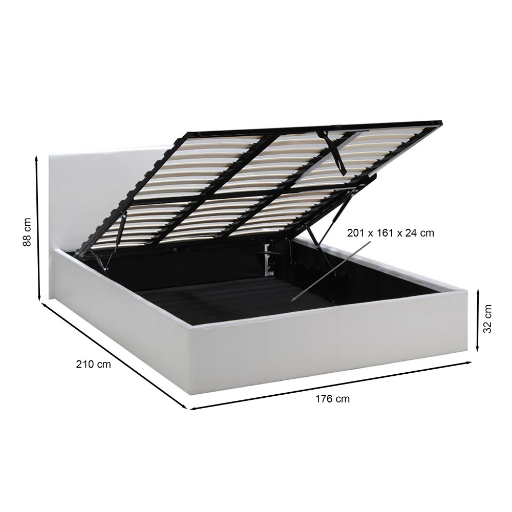 Lit double coffre BARCELONA 160 x 200 cm Avec son grand coffre, le lit BARCELONA est un très bon allier pour les petits espaces. Possédant un design compact et intemporel, il s'adapte aux goûts et décorations du plus grand nombre. Et puisqu'il n'y a jamais assez de rangement dans une maison, son coffre permet d'ajouter un espace de rangement supplémentaire sans perdre de place au sol.Caractéristiques :Structure métallique, revêtement cuir PU (polyuréthane), couleur blanche.Sommier 3x15 lattes multiplis. Section 52x8 mm.Hauteur : 32 cm - 88 cm avec tête de lit Livré démonté, à monter soi-même, avec tête de lit.Livré sans matelas, pour une bonne utilisation, nous vous conseillons une épaisseur maximale de matelas de 25cm, et un poids maximum de 30kg.Dimensions:210x176x88