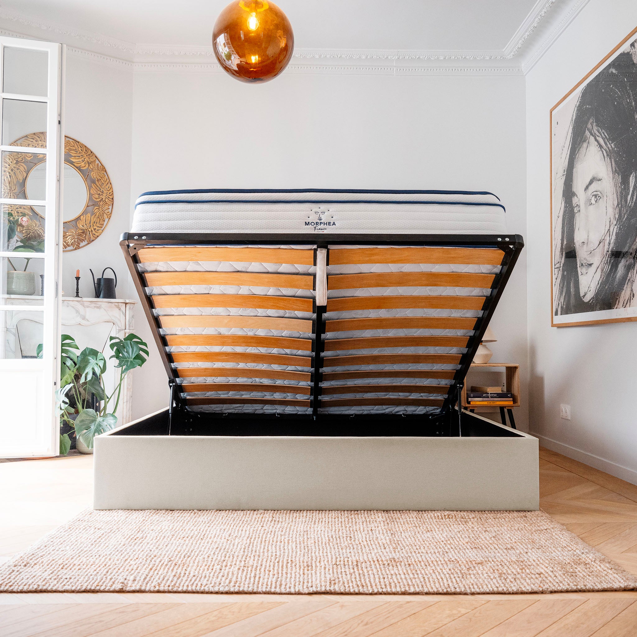 Alliez élégance et fonctionnalité avec le lit coffre Morphea, conçu pour offrir un confort de sommeil optimal tout en maximisant l'espace de rangement. Son design épuré s'intègre harmonieusement dans toutes les chambres, apportant une touche moderne et pratique.