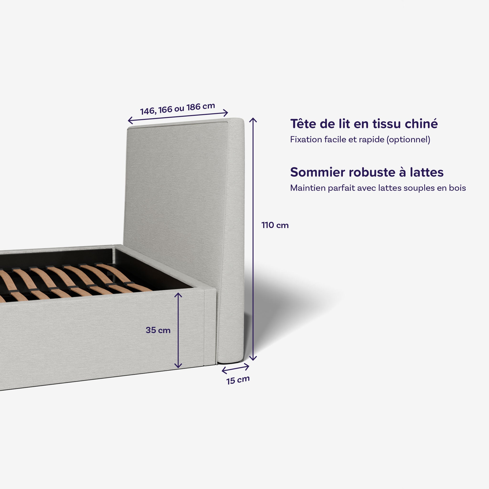 - Tête de lit (en option) : Rembourrée avec mousse de polyuréthane, offrant un confort supplémentaire pour la lecture ou la détente