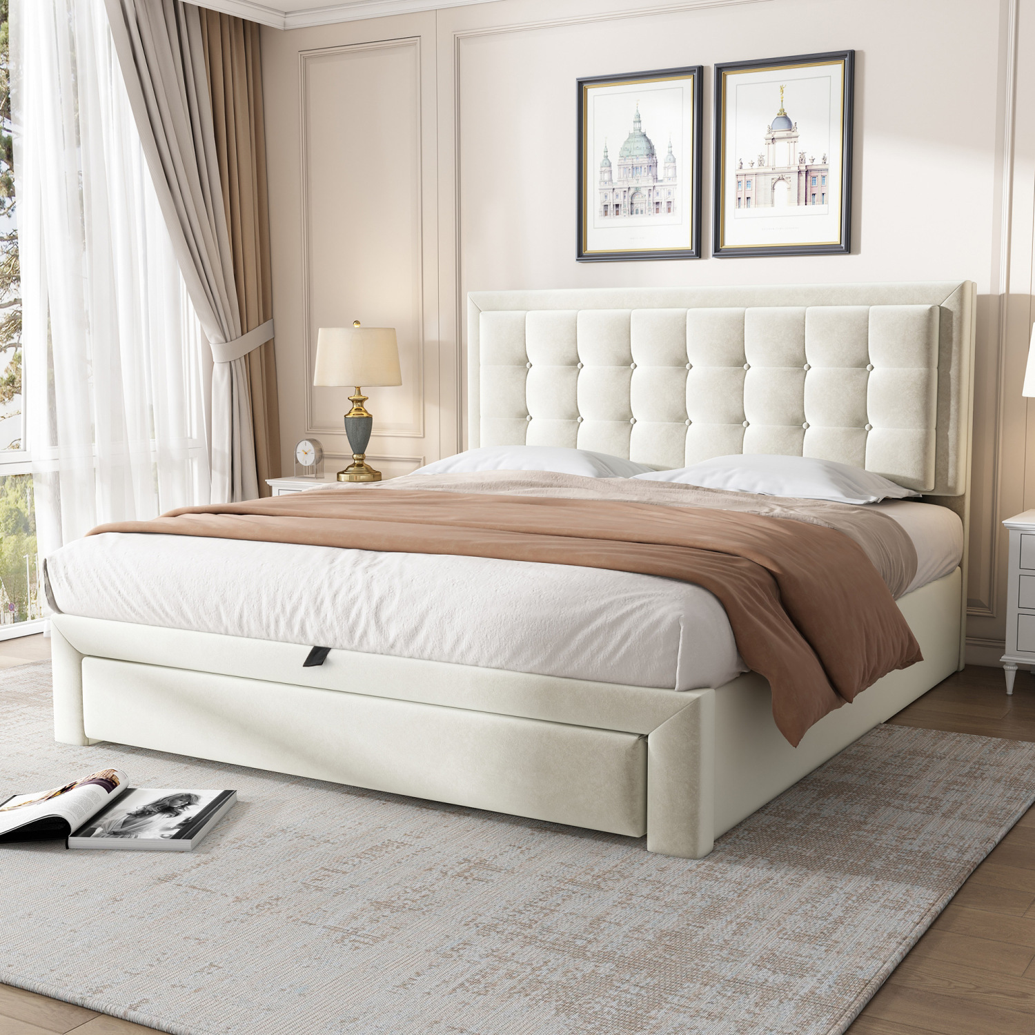 Lit coffre hydraulique lit 140x190 cm, lit 2 places adulte avec 2 tiroirs et tête de lit, velours, beige