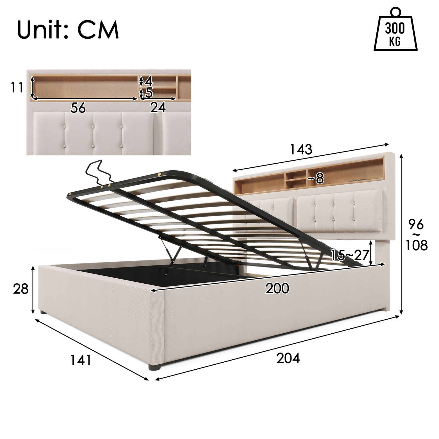 | Libellé | Lit coffre Lit 140x200 cm Lit 2 places, tête de lit avec chargement USB C et rangement, lin, beige |