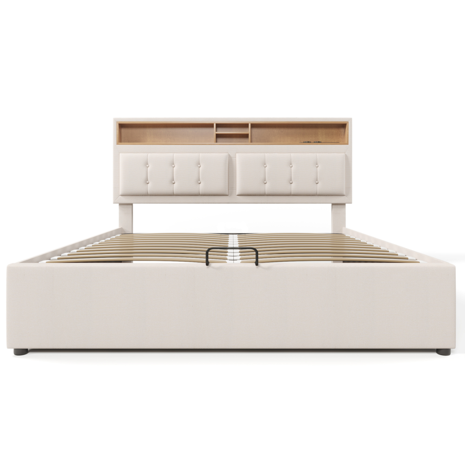 Lit coffre 140x200 lit 2 place, tête de lit avec espace de rangement, prise et fonction de charge USB, cadre de lit en métal avec lattes en bois, capacité de charge 300 kg, tissu Oxford sous le lit, anti-poussière, tissu en lin, doux pour la peau et respirant, beige, sans matelas.
