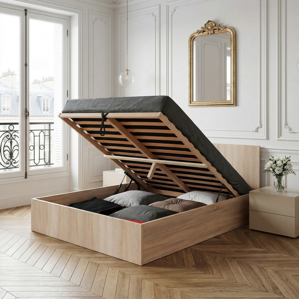 Lit coffre MADRID 140x200 + 1 sommier / Décor Chêne Blanchi