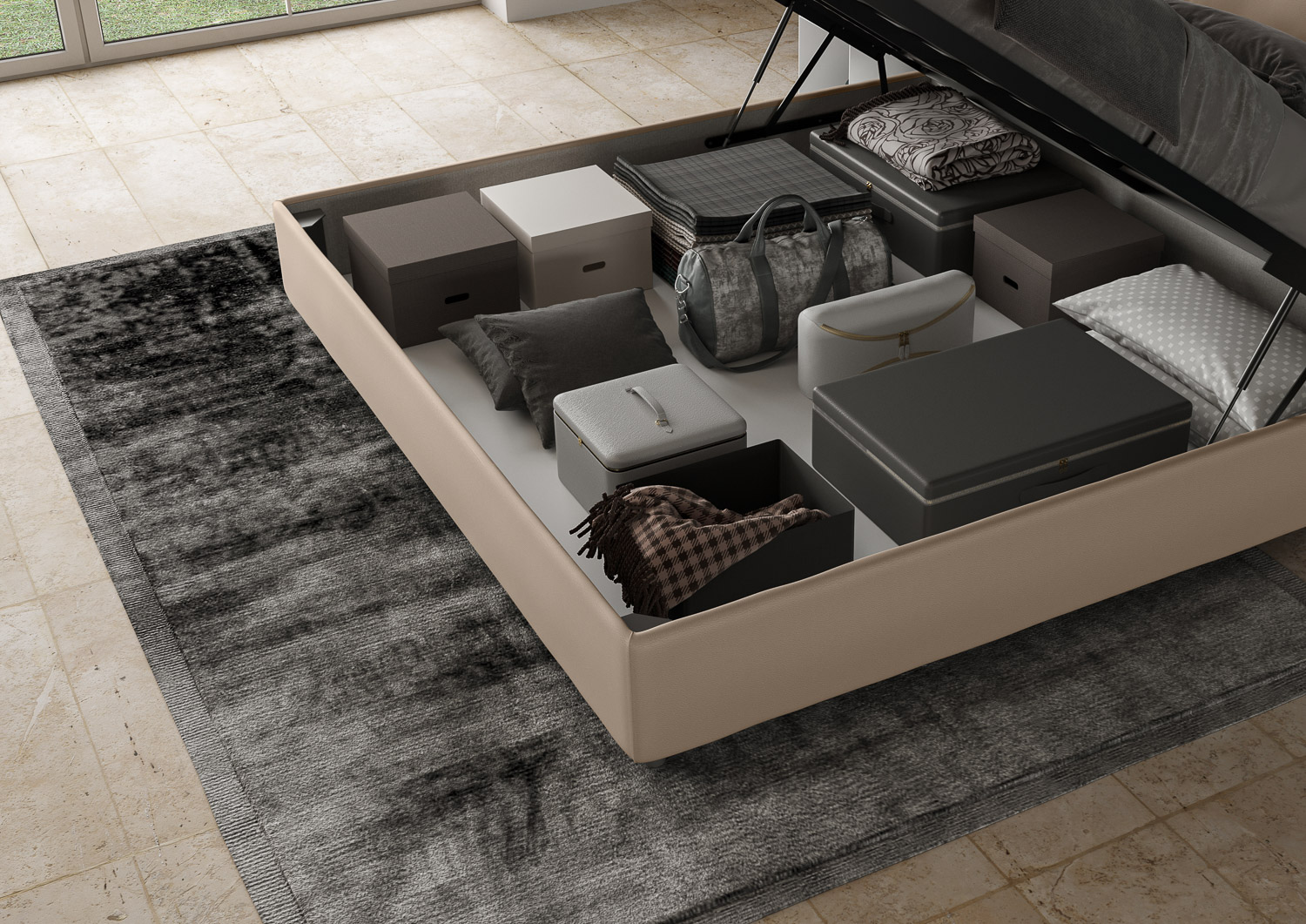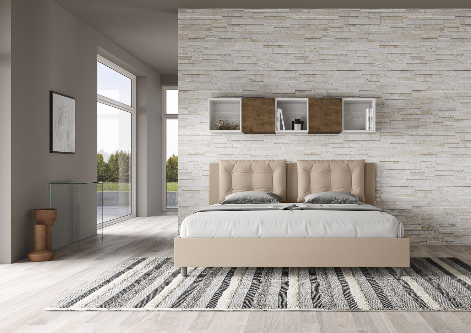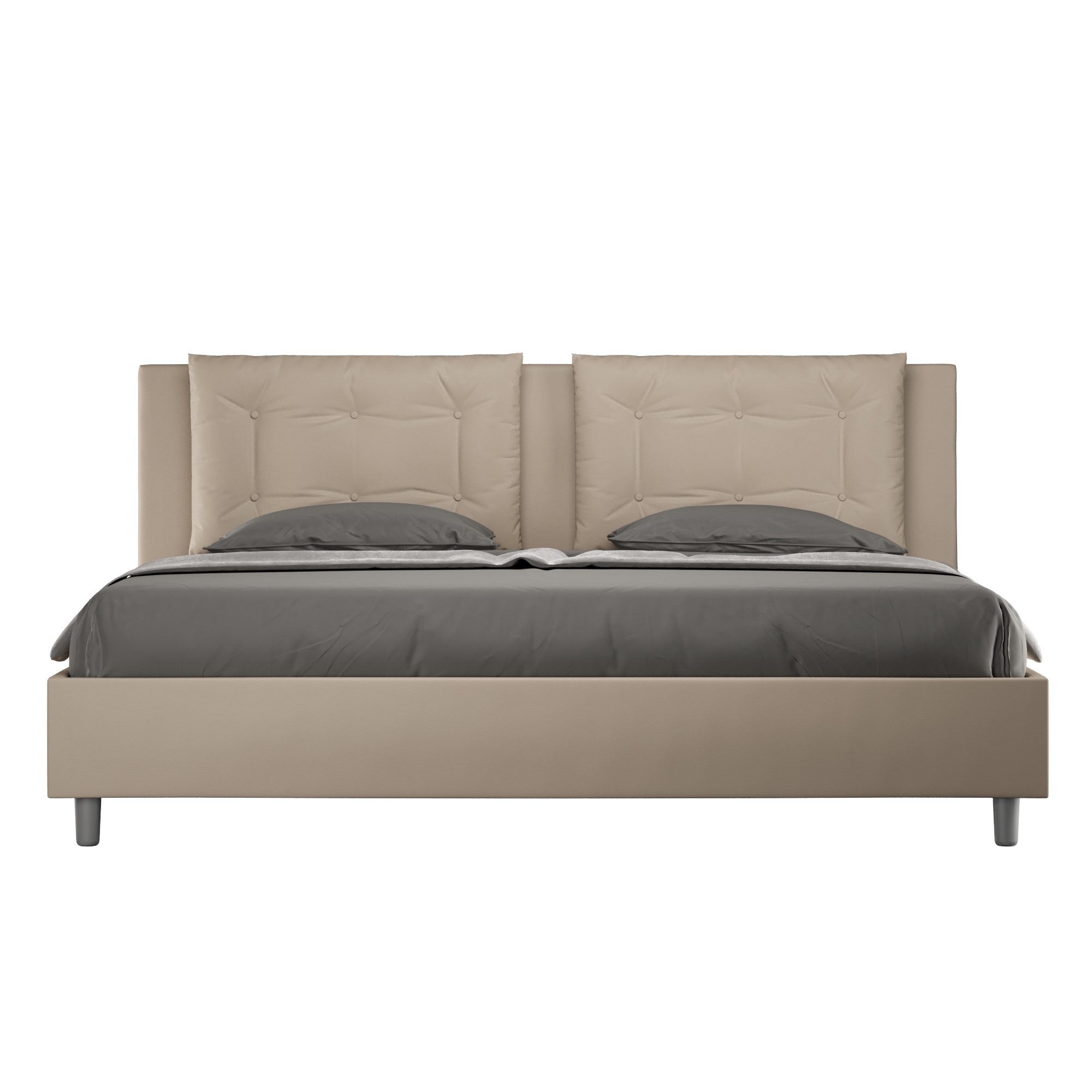 Lit coffre 180x190 Annalisa avec tête de lit et cadre de lit rembourrés, revêtement en PU, particulièrement polyvalent et facile à assortir à tout style de décoration. Le lit coffre 180x190 Annalisa est caractérisé par un style élégant et raffiné grâce aux grands coussins présents sur la tête de lit, il est entièrement revêtu en PU. La présence du PU, en plus de donner à la pièce une atmosphère chaleureuse et accueillante, offre la commodité d'un nettoyage facile et rapide, grâce à l'utilisation d'un simple chiffon en microfibre. Lit fourni avec un sommier à rangement, prévu pour un matelas de 180x190 cm - Matelas non inclus. Revêtement de lit non déhoussable. Produit Ityhome Made in Italy Dimensions: L.195 P.202 H.110 cm Hauteur pieds: 12 cm Hauteur du cadre de lit: 27 cm Hauteur du sommier depuis le sol: 38 cm Dimensions utiles du rangement: L.183 P.194 H.21 cm