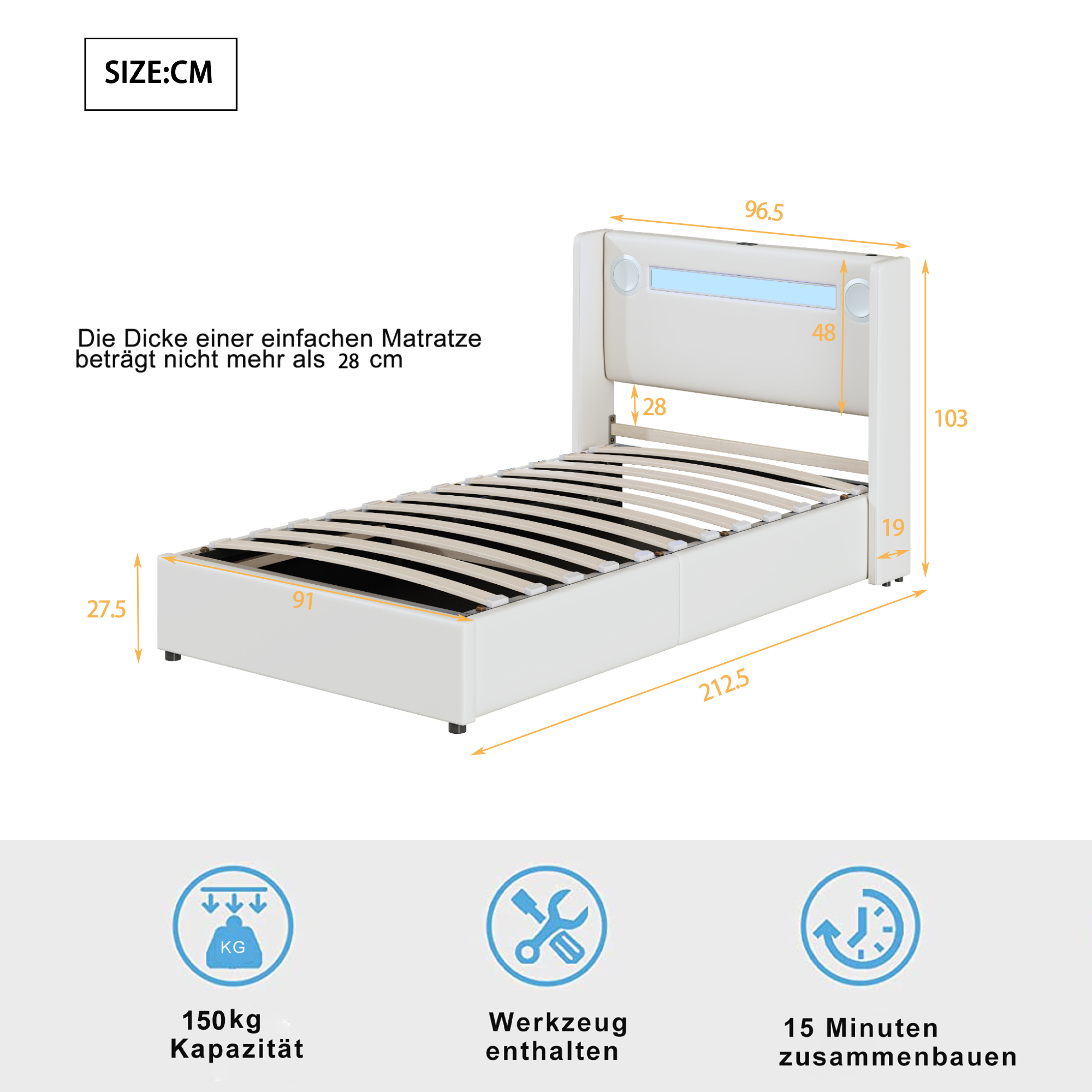 Lit Coffre Simple 90x200cm avec LED, Bluetooth et USB/Type-C, Lit Enfant avec Sommier à Lattes, PU, Blanc