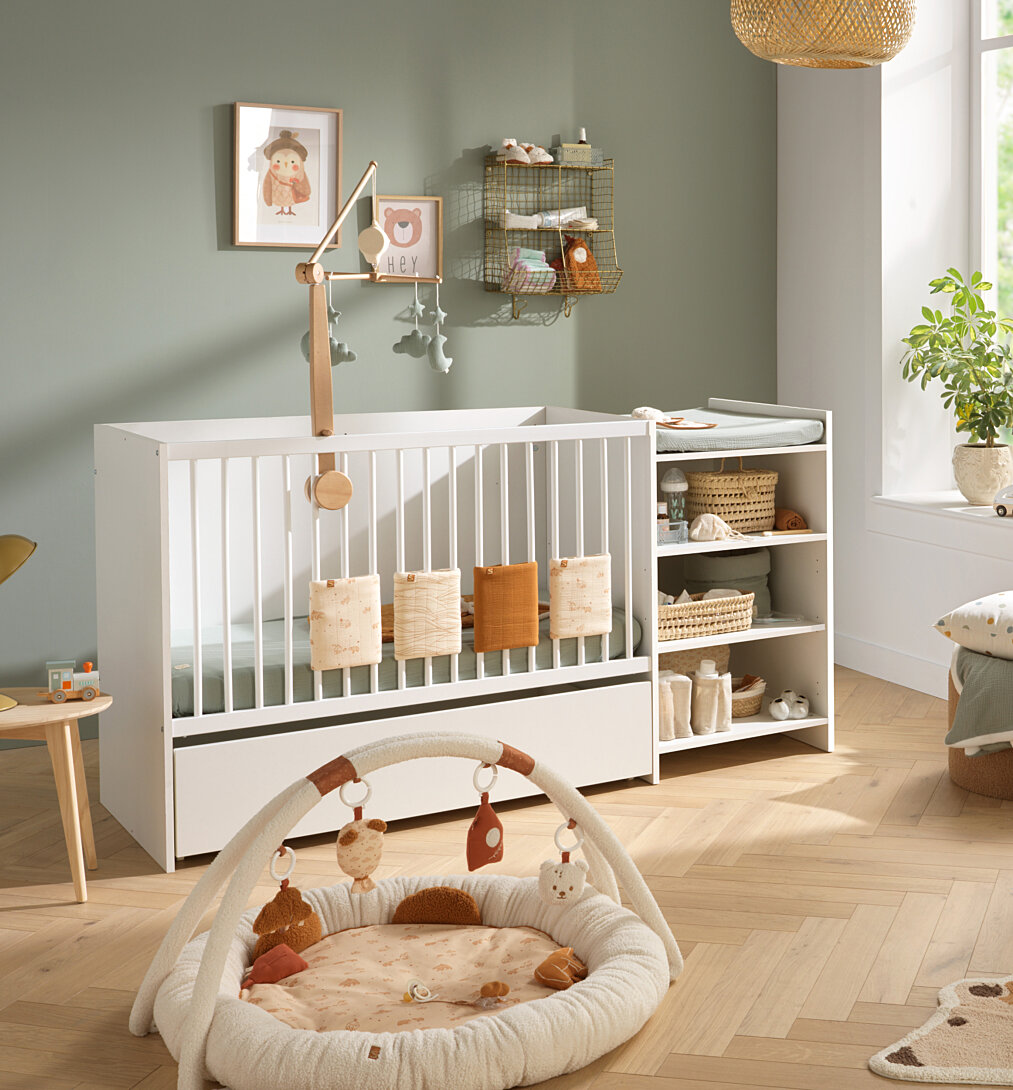 LIT CHAMBRE EVOLUTIF COMMODE ETAGERE DECOR BLANC FIRST Explorez les possibilités des meubles évolutifs avec notre lit de bébé combiné 120x60cm évolutif en lit junior 90x190cm de la collection First, une option économique qui allie fonctionnalité et style. Présenté dans une élégante teinte blanche, ce lit combiné offre une toile neutre pour la créativité dans la chambre de votre petit trésor. Conçu avec soin, ce lit économique se transforme au fil des années, évoluant de la douce quiétude du lit de bébé à la spacieuse autonomie du lit junior. La partie étagère, astucieusement accolée, offre un espace de rangement pratique et un plan à langer intégré, simplifiant les moments de lange. La simplicité du design blanc de la collection First apporte une luminosité rafraîchissante à la chambre de bébé, créant un environnement apaisant et accueillant. Fabriqué avec des matériaux durables, ce lit combiné économique garantit la sécurité de votre tout-petit tout en respectant votre budget. Optez pour l'économie sans compromis sur le style et la fonctionnalité avec notre lit de bébé combiné évolutif de la collection First. Créez un espace évolutif qui grandit avec votre enfant, tout en offrant praticité et douceur. Bienvenue dans le monde de la collection First, où chaque moment devient une étape mémorable. En version bébé: Matelas non fourni. En version transformée : Matelas et sommier de lit non fournis, compatible avec un matelas et sommier de lit L190 x l 90 Attention, les produits à caractère évolutif présentent des perçages non-utilisés dans certaines configurations et restant visibles. Livré en kit, à monter soi-même. COMPOSITION: Partie commode étagères Cotés, dessus, dessous, séparation horizontale et tablette, en panneaux particules mélaminés décor blanc, chants décor blanc. Derrière de meuble en panneaux de fibres minces, 1 face décor blanc. Volume Lit bébé Tête de lit et panneau galerie, en panneaux particules mélaminés décor blanc, chants décor blanc. 1 Galerie fixe, balustres ronds en hêtre laquée blanc. Sommier (3 positions) en panneaux de particules mélaminés décor blanc, Chants décor blanc. Transformation lit junior: Long-pans en panneaux particules mélaminés décor blanc, chants décor blanc. 2 traverses support sommier en hêtre brut. DIMENSIONS: 177 x 95 x 66 cm NORMES ET QUALITE: Matelas de lit non fourni, compatible avec un matelas de lit L 120 x l 60 x H 10 Matelas non fourni, la surface à langer est prévue pour recevoir un matelas à langer, de dimension : 68x52 cm, – H=6 cm En version transformée : Matelas et sommier de lit non fournis, compatible avec un matelas et sommier de lit L190 x l 90 Meuble à monter soi-même Afin d'utiliser la commode en toute sécurité, elle doit ètre fixée au mur; sangle fournie. Conforme à la norme NF EN 716 n° 1&2 Conforme à la norme NF EN 12221 1&2 (version juillet 2008) + A1 (version 2013) CONSEILS D'ENTRETIEN: En cas de tâches accidentelles, utiliser un linge propre. Ne pas frotter.