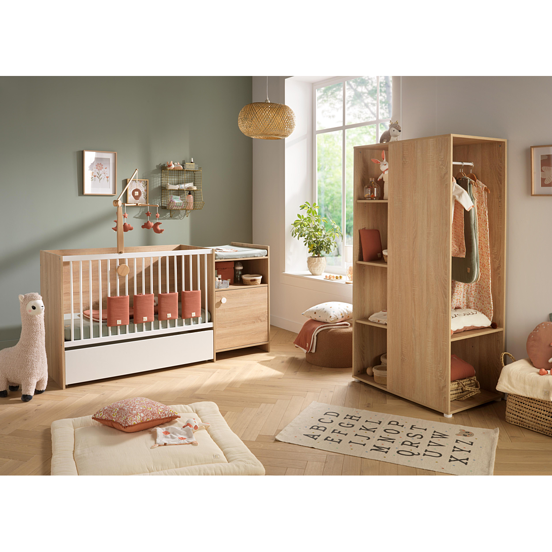 LIT CHAMBRE EVOLUTIF COMMODE 1 PORTE DECOR SONOMA UP CHENE DORE Plongez dans la douceur de l'enfance avec notre lit de bébé combiné évolutif Up Chêne Doré, une pièce maîtresse de la chambre de bébé qui allie fonctionnalité et lignes épurées. Ce lit évolutif 120x60cm, présenté dans un chaleureux décor bois chêne doré, promet un voyage enchanté du lit de bébé au lit junior. Imaginez un espace qui évolue avec votre enfant. La partie lit de bébé offre confort et sécurité, entourée par la chaleur du décor bois chêne doré qui crée une atmosphère apaisante. À ses côtés, la commode ingénieusement intégrée devient le point central de l'organisation. La commode présente une niche et une porte ornée d'un bouton circulaire blanc, ajoutant une touche moderne et ludique. À l'intérieur, un espace bien pensé pour ranger les essentiels de bébé en toute simplicité. Sur le dessus de la commode, découvrez un plan à langer pratique, transformant les moments de soin en instants de complicité, pratique la niche permet d'avoir tous le nécessaire à porter de main lors du lange. Lorsque votre tout-petit grandit, le lit et la commode fusionnent en un duo parfait. Le lit junior spacieux de 90x190cm devient le refuge confortable, tandis que la commode reste un compagnon fidèle dans l'organisation de la chambre. En version bébé: Matelas non fourni. En version transformée : Matelas et sommier de lit non fournis, compatible avec un matelas et sommier de lit L190 x l 90 Attention, les produits à caractère évolutif présentent des perçages non-utilisés dans certaines configurations et restant visibles. Livré en kit, à monter soi-même. COMPOSITION: Partie commode étagères Cotés, dessus, dessous, séparation horizontale, porte et tablette, en panneaux particules mélaminés décor Chêne doré, chants décor bois. Derrière de meuble en panneaux de fibres minces, 1 face décor bois. 1 bouton plastique blanc. Volume Lit bébé Tête de lit et panneau galerie, en panneaux particules mélaminés décor Chêne doré, chants décor bois. 1 Galerie fixe, balustres ronds en hêtre laquée blanc. Sommier (3 positions) en panneaux de particules mélaminés décor blanc, Chants décor blanc. Transformation lit junior: Long-pans en panneaux particules mélaminés décor blanc, chants décor blanc. 2 traverses support sommier en hêtre brut. DIMENSIONS: 177 x 95 x 66 cm NORMES ET QUALITE: Matelas de lit non fourni, compatible avec un matelas de lit L 120 x l 60 x H 10 Matelas non fourni, la surface à langer est prévue pour recevoir un matelas à langer, de dimension : 68x52 cm, – H=6 cm En version transformée : Matelas et sommier de lit non fournis, compatible avec un matelas et sommier de lit L190 x l 90 Meuble à monter soi-même Afin d'utiliser la commode en toute sécurité, elle doit ètre fixée au mur; sangle fournie. Conforme à la norme NF EN 716 n° 1&2 Conforme à la norme NF EN 12221 1&2 (version juillet 2008) + A1 (version 2013) CONSEILS D'ENTRETIEN: En cas de tâches accidentelles, utiliser un linge propre. Ne pas frotter.