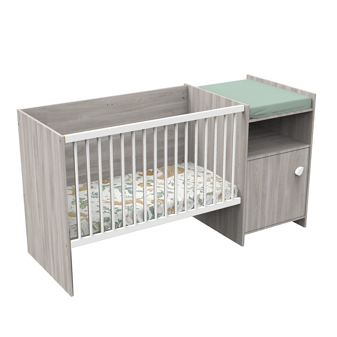 Imaginez un espace qui évolue avec votre enfant. La partie lit de bébé offre confort et sécurité, entourée par le décor bois chêne silex qui crée une atmosphère apaisante. À ses côtés, la commode ingénieusement intégrée devient le point central de l'organisation.