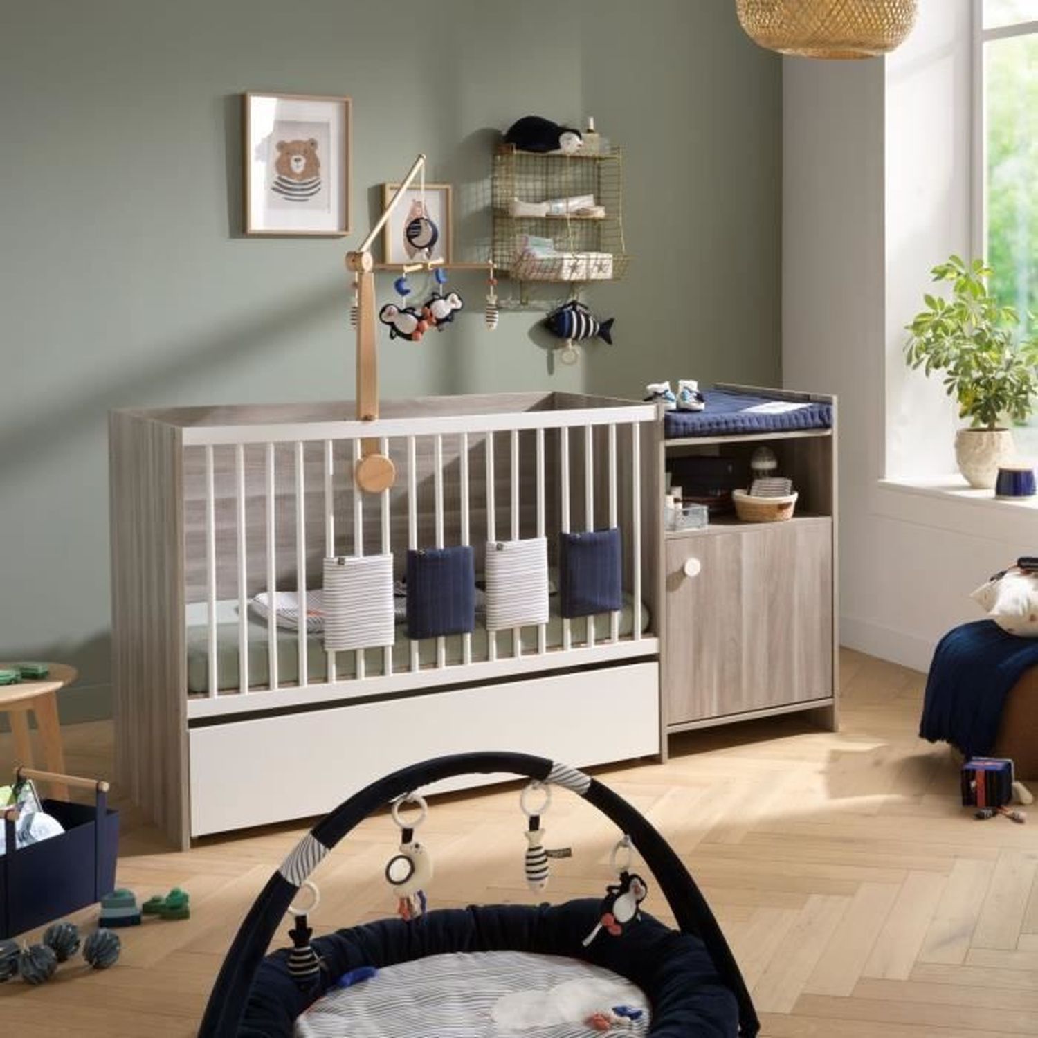 LIT CHAMBRE EVOLUTIF COMMODE 1 PORTE DECOR CHENE SILEX UP CHENE SILEX Plongez dans la douceur de l'enfance avec notre lit de bébé combiné évolutif Up Chêne Silex, une pièce maîtresse de la chambre de bébé qui allie fonctionnalité et lignes épurées. Ce lit évolutif 120x60cm, présenté dans un décor bois chêne silex, promet un voyage enchanté du lit de bébé au lit junior. Imaginez un espace qui évolue avec votre enfant. La partie lit de bébé offre confort et sécurité, entourée par le décor bois chêne silex qui crée une atmosphère apaisante. À ses côtés, la commode ingénieusement intégrée devient le point central de l'organisation. La commode présente une niche et une porte ornée d'un bouton circulaire blanc, ajoutant une touche moderne et ludique. À l'intérieur, un espace bien pensé pour ranger les essentiels de bébé en toute simplicité. Sur le dessus de la commode, découvrez un plan à langer pratique, transformant les moments de soin en instants de complicité, pratique la niche permet d'avoir tous le nécessaire à porter de main lors du lange. Lorsque votre tout-petit grandit, le lit et la commode fusionnent en un duo parfait. Le lit junior spacieux de 90x190cm devient le refuge confortable, tandis que la commode reste un compagnon fidèle dans l'organisation de la chambre. En version bébé: Matelas non fourni. En version transformée : Matelas et sommier de lit non fournis, compatible avec un matelas et sommier de lit L190 x l 90 Attention, les produits à caractère évolutif présentent des perçages non-utilisés dans certaines configurations et restant visibles. Livré en kit, à monter soi-même. COMPOSITION: Partie commode étagères Cotés, dessus, dessous, séparation horizontale, porte et tablette, en panneaux particules revêtus papier décor Chêne silex, chants décor bois. Derrière de meuble en panneaux de fibres minces, 1 face décor blanc. 1 bouton plastique blanc. Volume Lit bébé Tête de lit et panneau galerie, en panneaux particules revêtus papier décor Chêne silex, chants décor bois. 1 Galerie fixe, balustres ronds en hêtre laquée blanc. Sommier (3 positions) en panneaux de particules mélaminés décor blanc, Chants décor blanc. Transformation lit junior: Long-pans en panneaux particules mélaminés décor blanc, chants décor blanc. 2 traverses support sommier en hêtre brut. DIMENSIONS: 177 x 95 x 66 cm NORMES ET QUALITE: Matelas de lit non fourni, compatible avec un matelas de lit L 120 x l 60 x H 10 Matelas non fourni, la surface à langer est prévue pour recevoir un matelas à langer, de dimension : 68x52 cm, – H=6 cm En version transformée : Matelas et sommier de lit non fournis, compatible avec un matelas et sommier de lit L190 x l 90 Meuble à monter soi-même Afin d'utiliser la commode en toute sécurité, elle doit ètre fixée au mur; sangle fournie. Conforme à la norme NF EN 716 n° 1&2 Conforme à la norme NF EN 12221 1&2 (version juillet 2008) + A1 (version 2013) CONSEILS D'ENTRETIEN: En cas de tâches accidentelles, utiliser un linge propre. Ne pas frotter