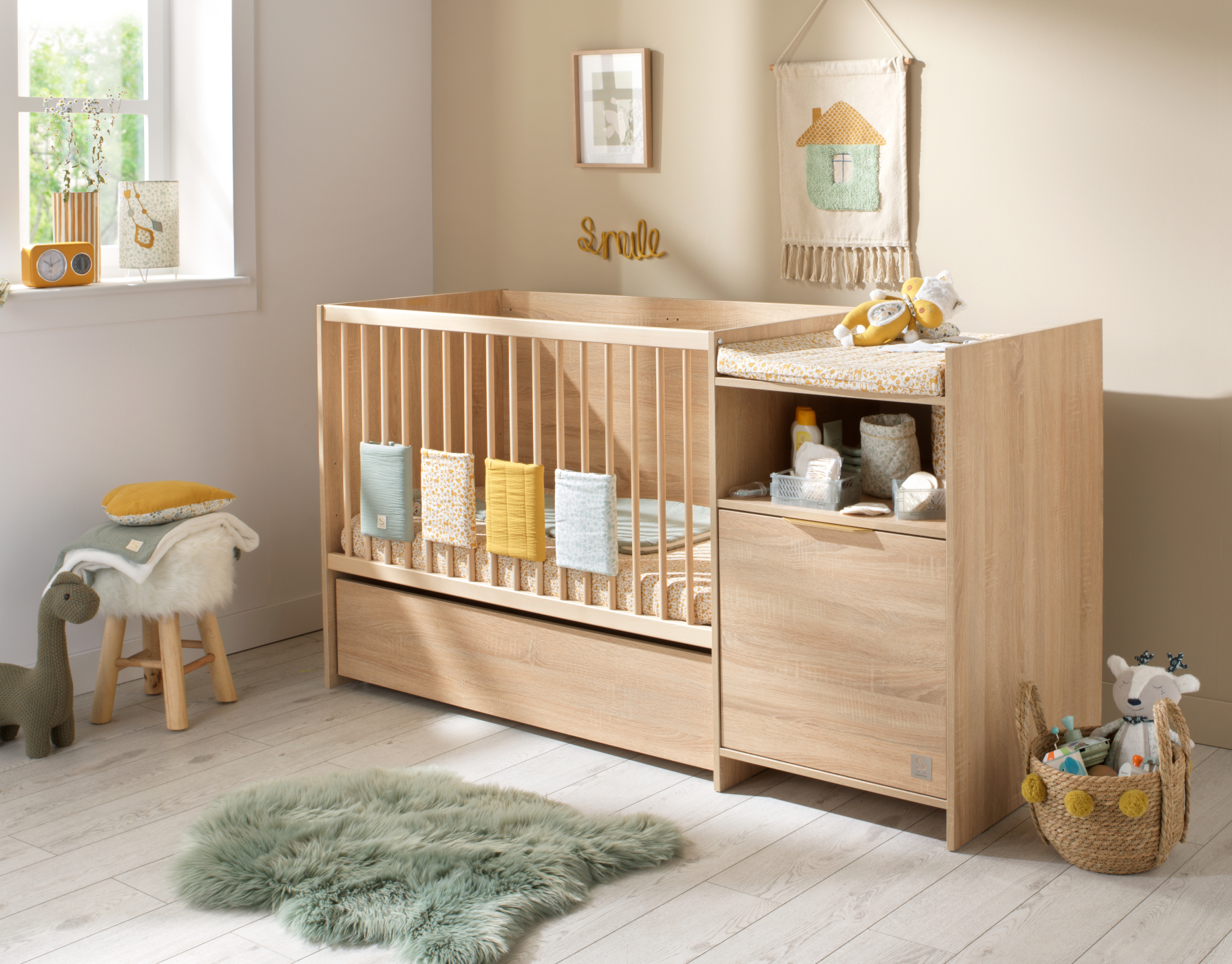 Préparez à bébé une petite chambre élégante au design intemporel avec le lit combiné évolutif de la collection Azur. Pratique, ce lit grandit avec bébé en se transformant en lit junior 90x190cm et sa commode séparée.