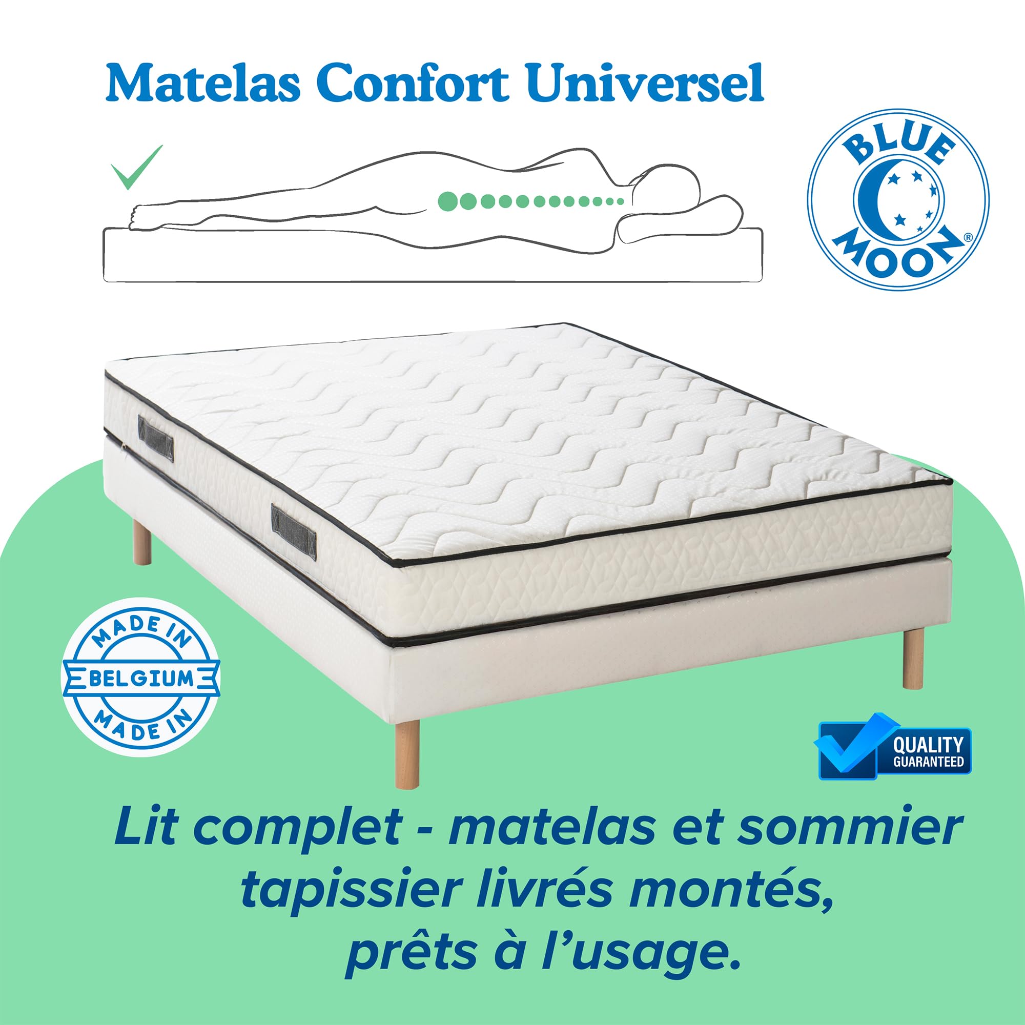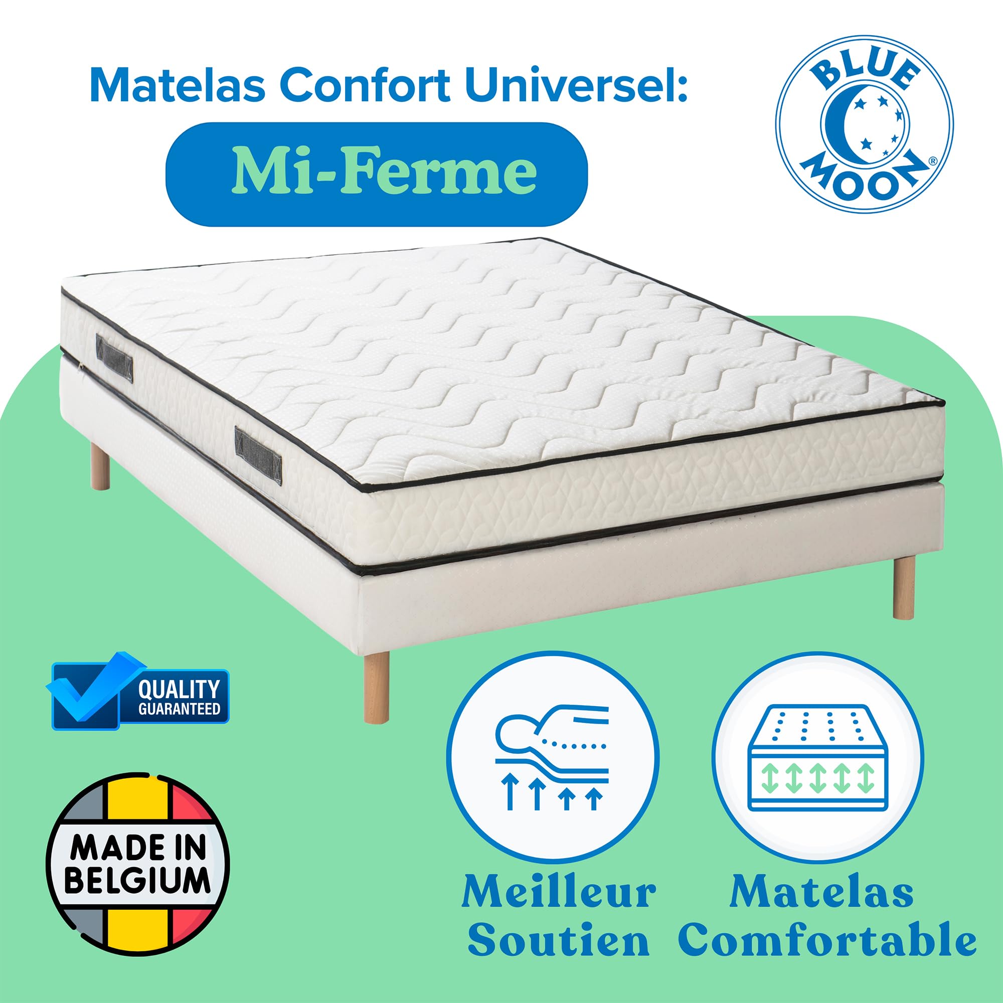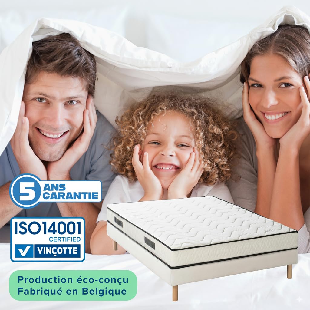 Lit Complet 160x200 Matelas 15cm Mi-ferme + Sommier Tapissier Pin Pieds Hêtre Massif Fabr. Belge 5 Ans