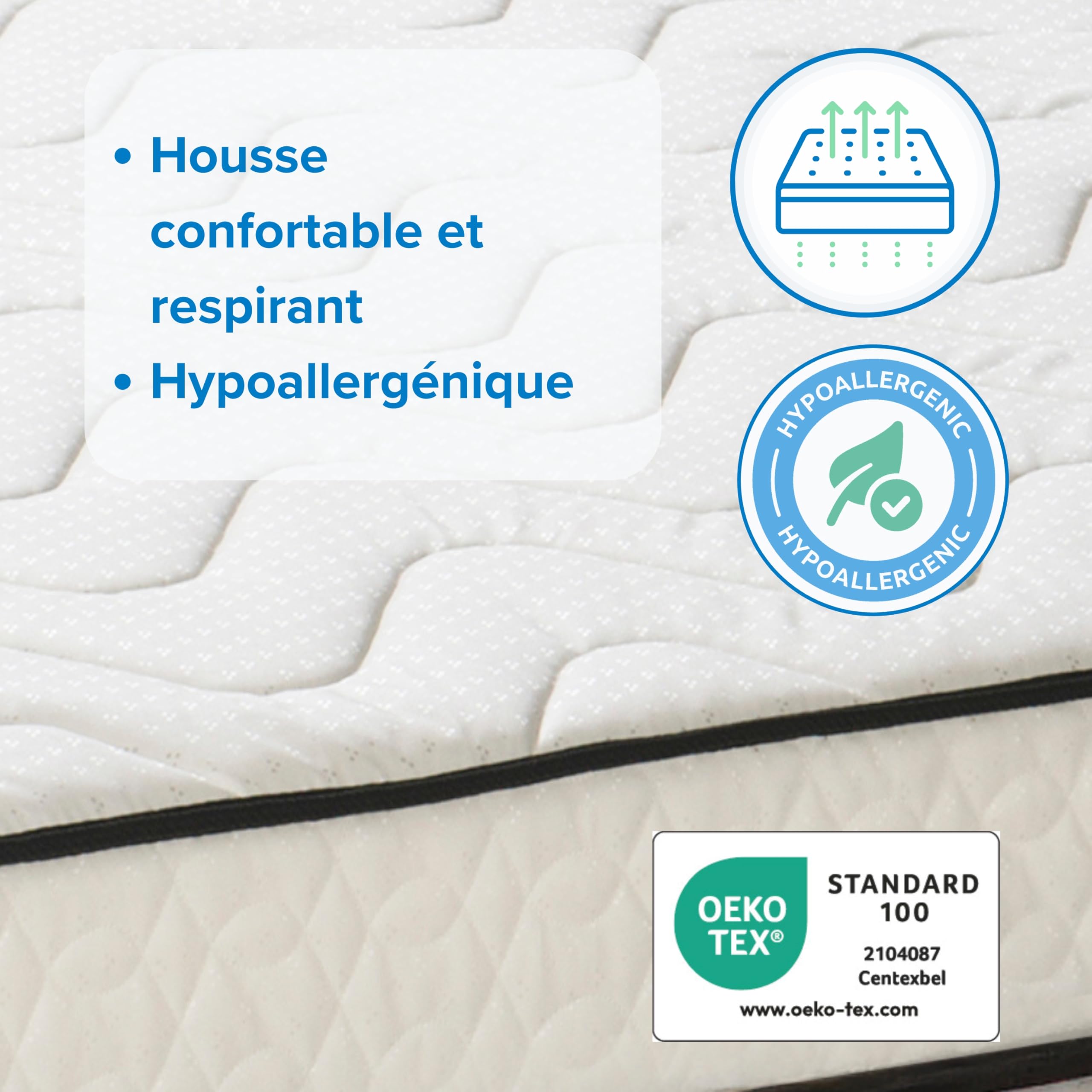 La conception du matelas et son coutil tissé de qualité supérieure favorisent une aération optimisée. L'air circule librement à travers la structure en mousse, régulant la température et évacuant l'humidité pour vous garantir des nuits plus fraîches et plus saines. Sa nature hypoallergénique, validée par sa certification, en fait un choix parfait pour un confort hygiénique nuit après nuit. Le coutil de votre matelas est certifié STANDARD 100 by OEKO-TEX®, garantissant l'absence de substances nocives.