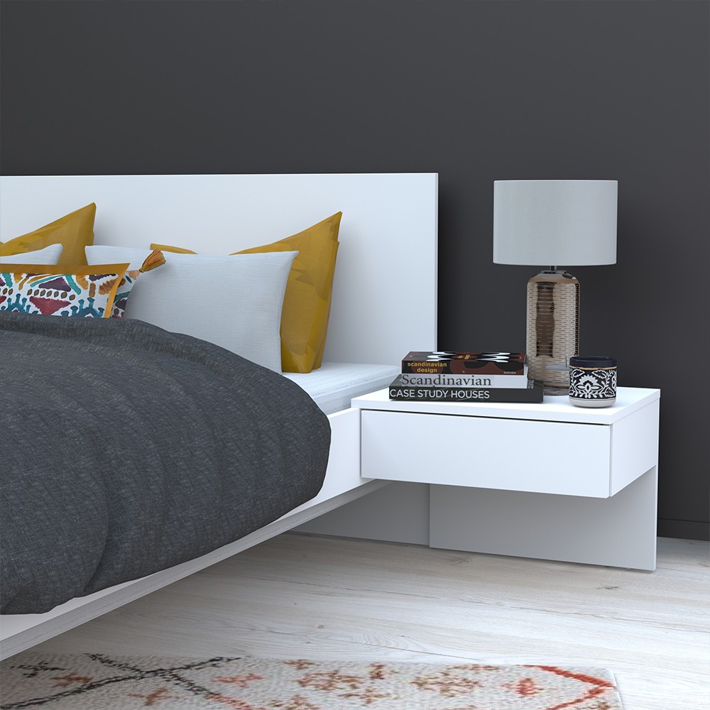 Lit COOL 140x190 cmLe lit COOL allie modernité et praticité avec ses deux chevets suspendus intégrés à la structure de lit. Astucieux, les chevets suspendus ne prennent pas de place au sol et possède chacun un tiroir. Son design intemporel lui permettra de s'adapter dans des décorations contemporaines ou très originale. Caractéristiques : Structure en panneau de particules.12 lattes multiplis, section 70x8mm.Finition : blancDimensions des chevets : 45x36x34 cmDimensions intérieures des tiroirs : 36x28x9 cmLivré démonté avec un sommier.Dimensions:192x234x75 cm